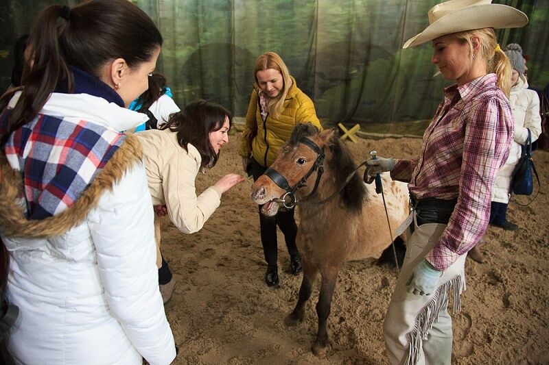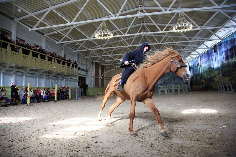 Посещение комплекса вы начнете с «личного» знакомства с скакунами. Только лошадей более дюжины, а еще есть две зебры, ослик, который возит на мельницу зерно. Опытные конюхи научат вас ухаживать за лошадьми: научиться не бояться и не пугать ее, кормить, чистить шерсть. А где еще вы сможете погладить, покормить, просто потрогать зебру? Вас обучат запрягать лошадь, как для верховых прогулок, так и для поездок в фаэтоне. Освоив азы конного дела, вы совершенно другими глазами посмотрите на конное представление.