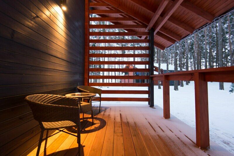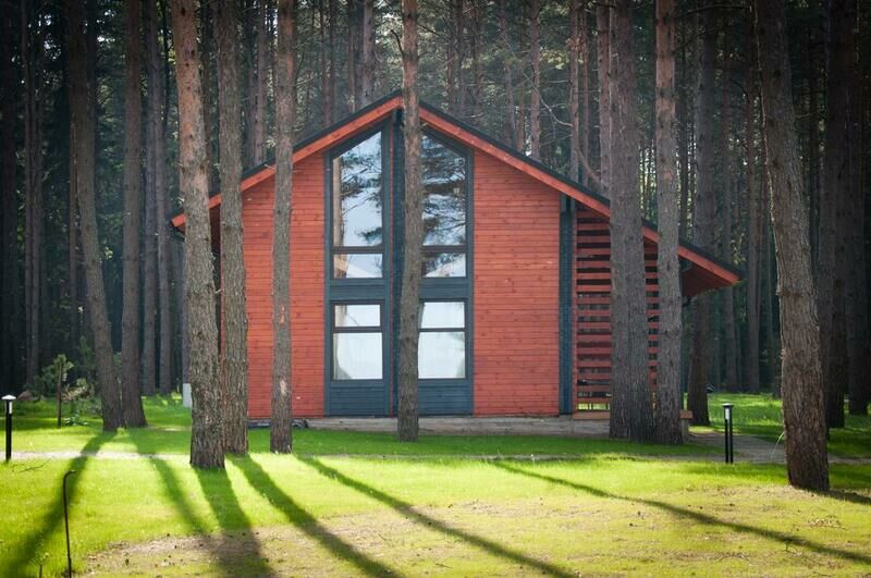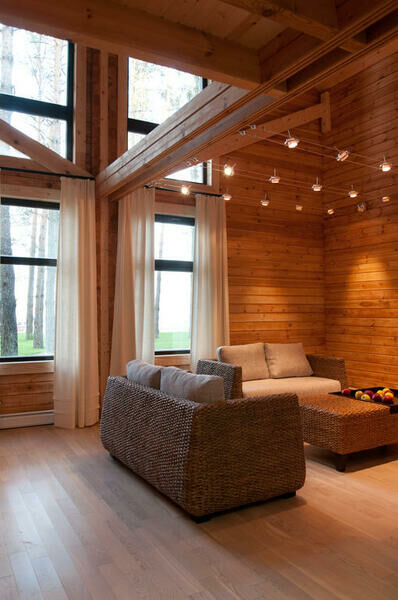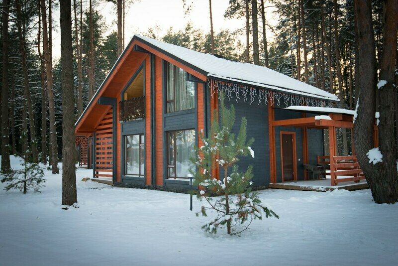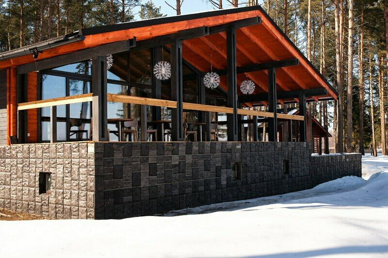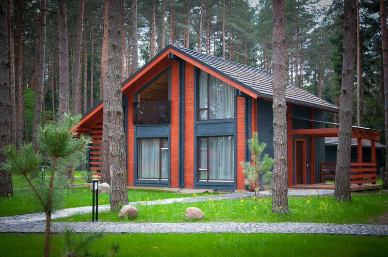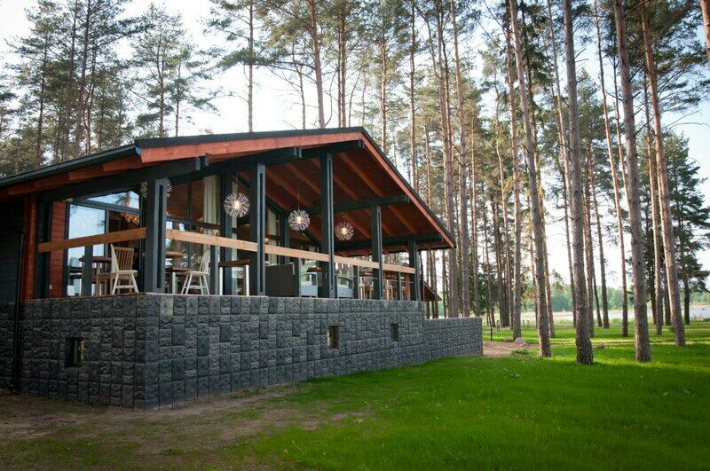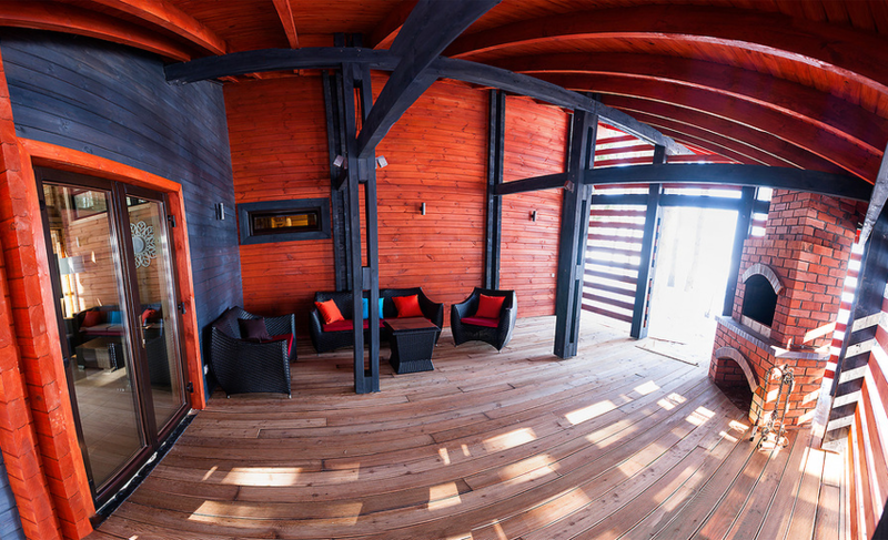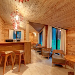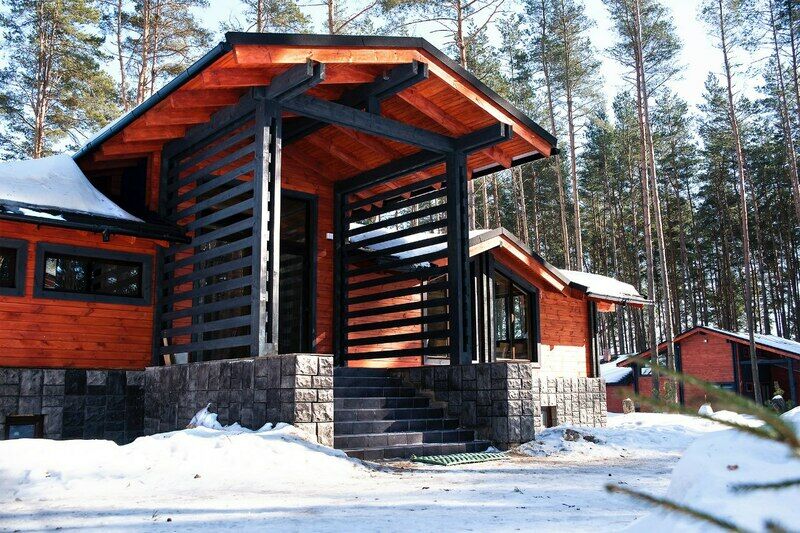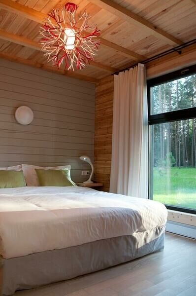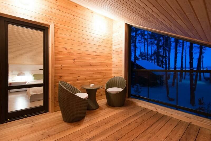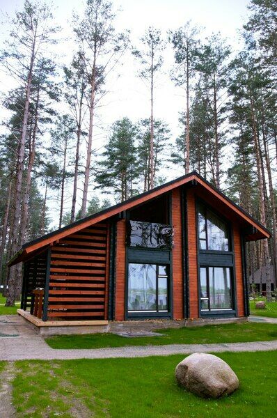 Домик VIP построен в эко-стиле, в нем приятно пахнет деревом, а окна в пол позволяют любоваться прекрасными видами на лес и озеро отовсюду. Размер дома: 60 м².