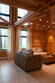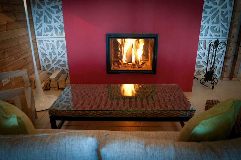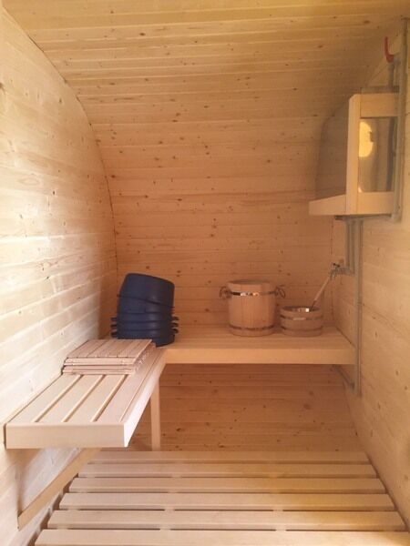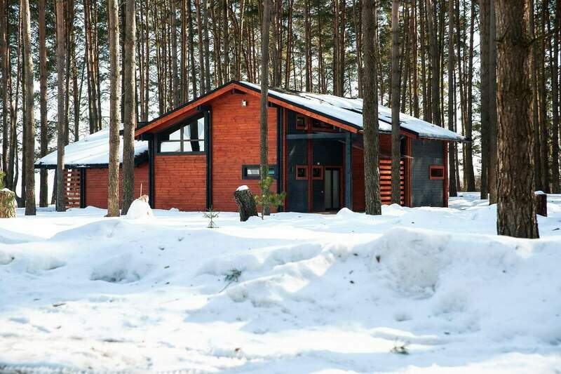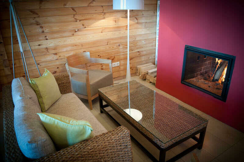 В домике 2 комнаты для отдыха с двуспальными кроватями, на первом и втором этажах. А так же гостиная с камином и верхним светом. Для удобства гостей предусмотрены две душевых комнаты, фен, телевизор на стене, холодильник для вина. Плотные шторы обеспечивают комфортный полноценный сон, а теплый свет ламп создает уют в вечернее время.