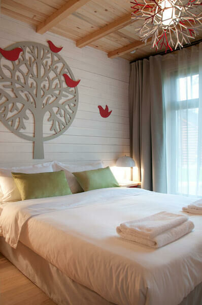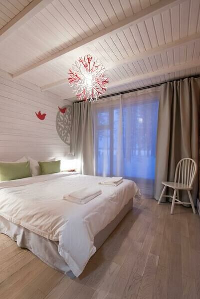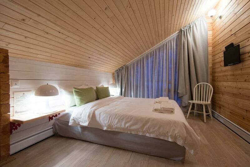 Номер находится на втором этаже домика, построенного из соснового бруса. Благодаря индивидуальному дизайну в нем уютно и приятно пахнет деревом. Одна из стен полностью стеклянная, что позволяет любоваться красотой леса и озера лежа в кровати. Размер номера 30 м².