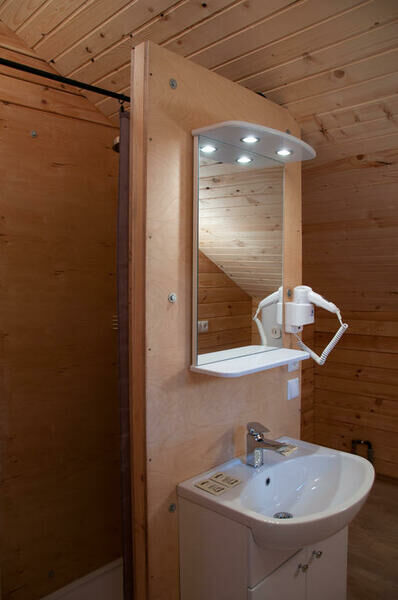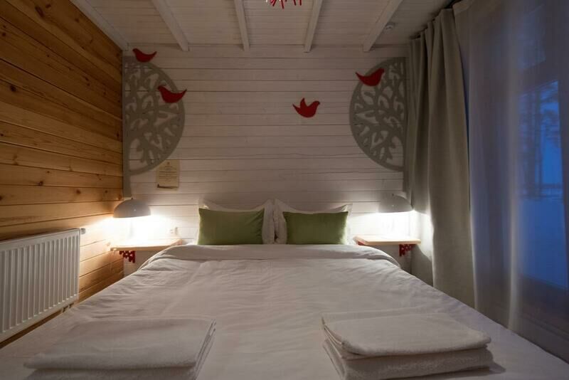 В домике два этажа, он рассчитан на 2 посетителей. На первом этаже располагается гостиная с верхним светом, а на втором этаже одна двуспальная кровать. Для удобства гостей предусмотрены душевая комната, фен, телевизор, wi-fi.