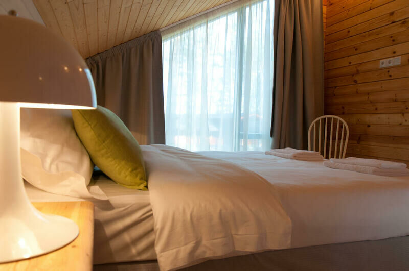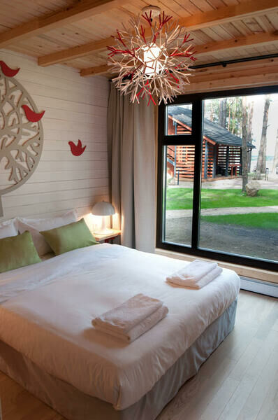 Номер находится на первом этаже домика, построенного из соснового бруса. Благодаря индивидуальному дизайну в нем уютно и приятно пахнет деревом. Одна из стен полностью стеклянная, что позволяет любоваться красотой леса и озера лежа в кровати. Размер номера 20 м².