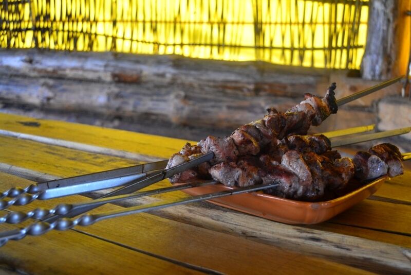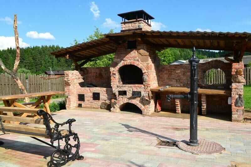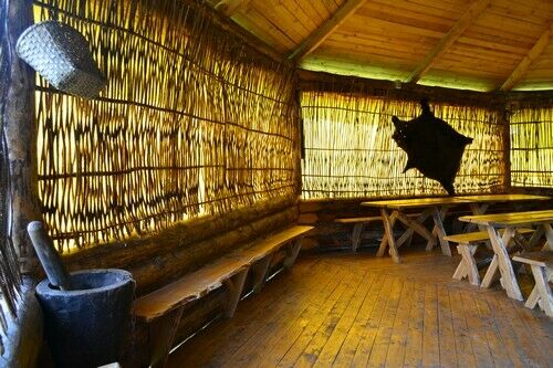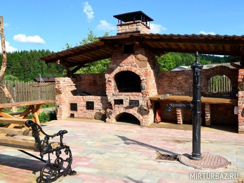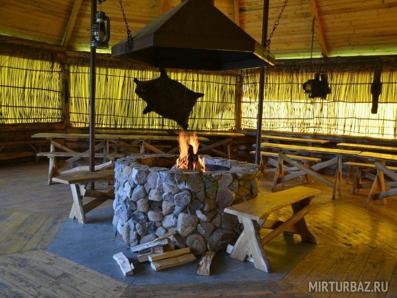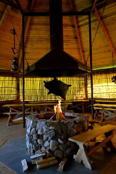 Большая крытая беседка на 80 человек с открытым очагом в центре. Интересный вариант для проведение свадеб и банкетов.