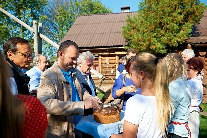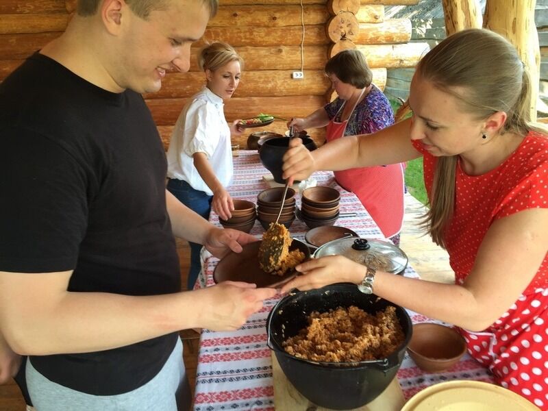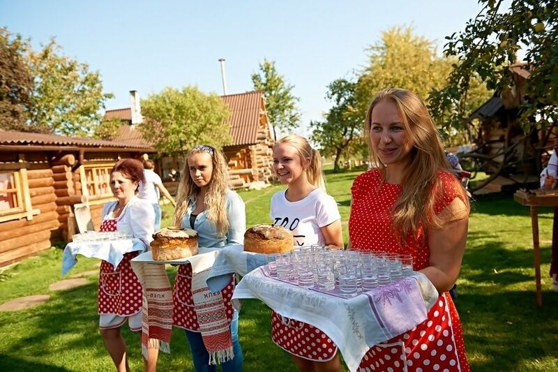 После традиционной встречи с хлебом-солью и чаркой самогона, гостей накормят традиционными блюдами, приготовленными из экологически чистых продуктов в русской печи, и порадуют развлечениями на любой вкус.
