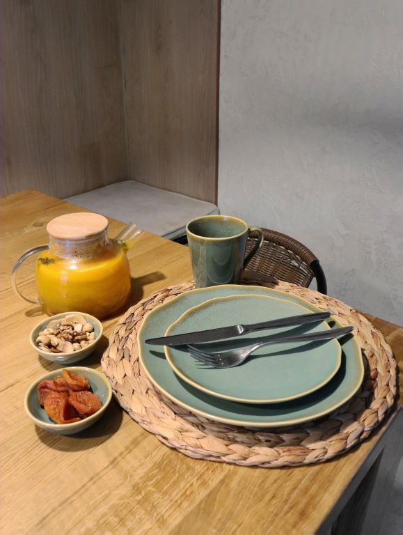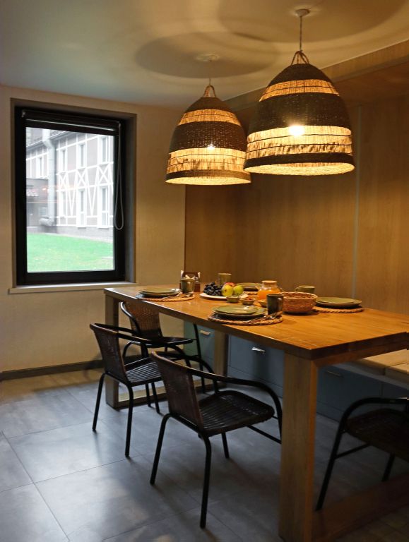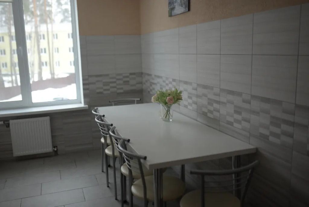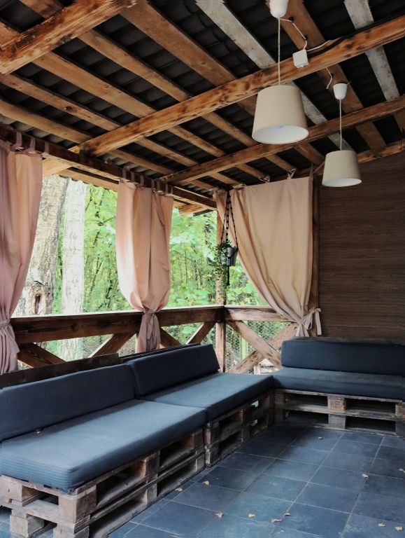 - просторная обеденная зона, оборудованная кухня, меблированная терраса с видом на лес, комната отдыха с двуспальной кроватью — здесь можно попить чай и отдохнуть в перерывах между парениями.