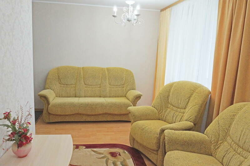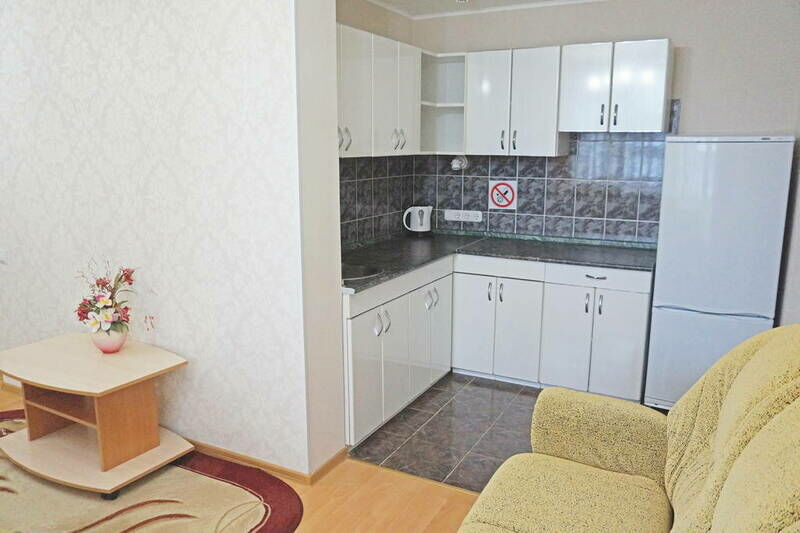 В номере спальня с 2-х спальной кроватью, ванная комната, гостиная с раскладным диваном, телевизор. Холл оснащен мини-кухней (столовые приборы, холодильник, чайник).