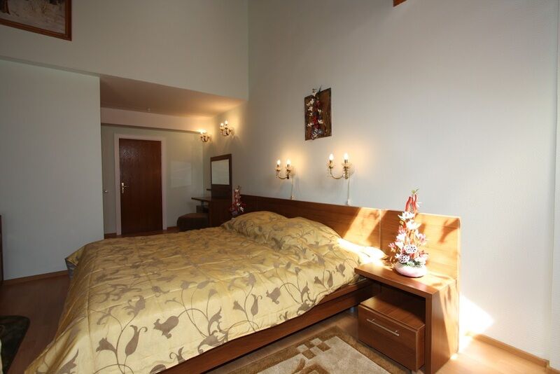 Номер расположен на двух этажах. На первом этаже холл, гостиная с раскладным диваном, мини-кухней (столовые приборы, холодильник, чайник), телевизор. На втором этаже располагается спальня с 2-х спальной кроватью, ванная комната, телевизор.