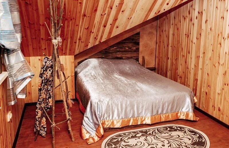 Двухспальная кровать, на этаже чайник, холодильник, набор посуды, электроплита