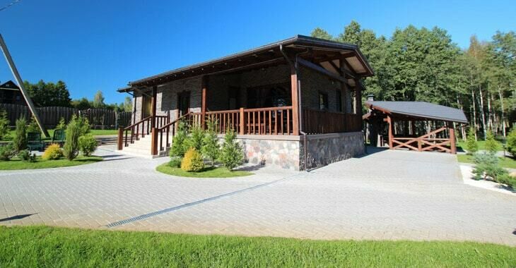 Дом у озера расположен в 50 метрах от берега озера Снуды в центральной части комплекса, поэтому от него можно быстро добраться до пирса, бани или кафе. Территория вокруг дома имеет большую площадь и включает в себя зеленую зону, парковку, вымощенные освещенные дорожки и беседку для барбекю. Фасад дома отделан деревом и кирпичом ручной работы.