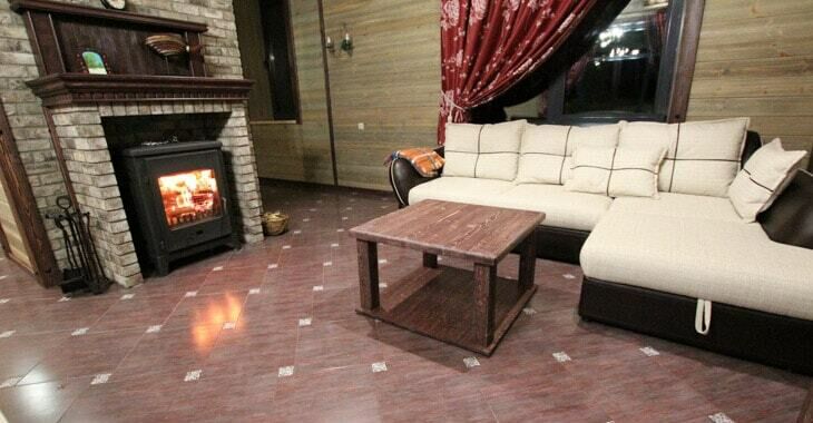 - Гостиная: Панорамные окна, спутниковое TV, камин, диван, обеденный стол
