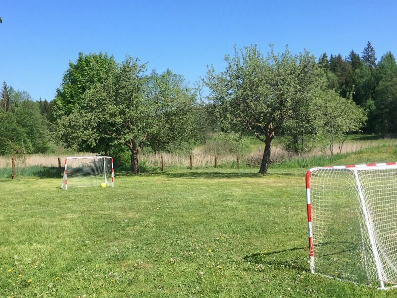 На базе есть площадка для игры в футбол, с воротами и мячом.