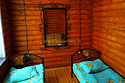 Двухместные коттеджи. В домиках по две односпальные кровати, телевизор, раскладной диван, холодильник, чайник. Есть ванная комната (душ, туалет).
