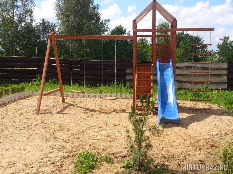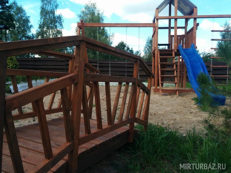 Новый большой детский игровой комплекс. Он включает в себя песочницу, игровую башню с лестницей, 2-ое качелей, стену-скалолаз, веревочную лестницу, горку, шведскую стенку с турником. Все выполнено из многослойного соснового бруса из массив сосны с покрытием Pinotex, Tikkurila.