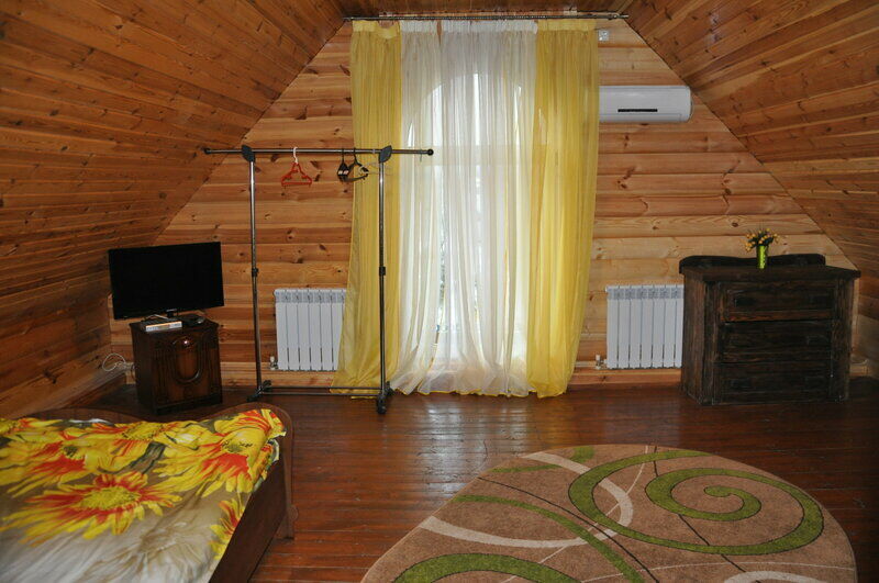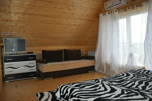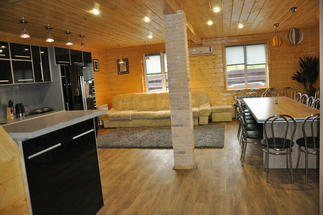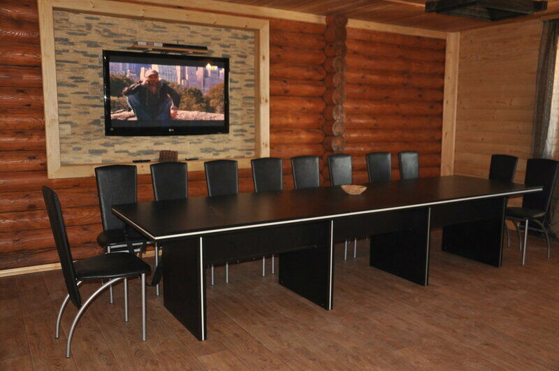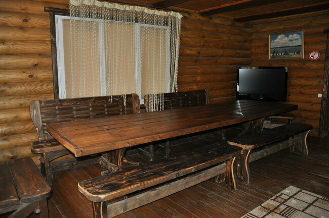 Уютная гостиная с диваном (3 на 2 метра), большим плазменным телевизором с пакетом каналов НТВ+, большим столом до 26 персон, кондиционером и печью-камином для поддержания уюта в долгие зимние вечера.