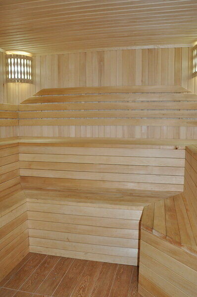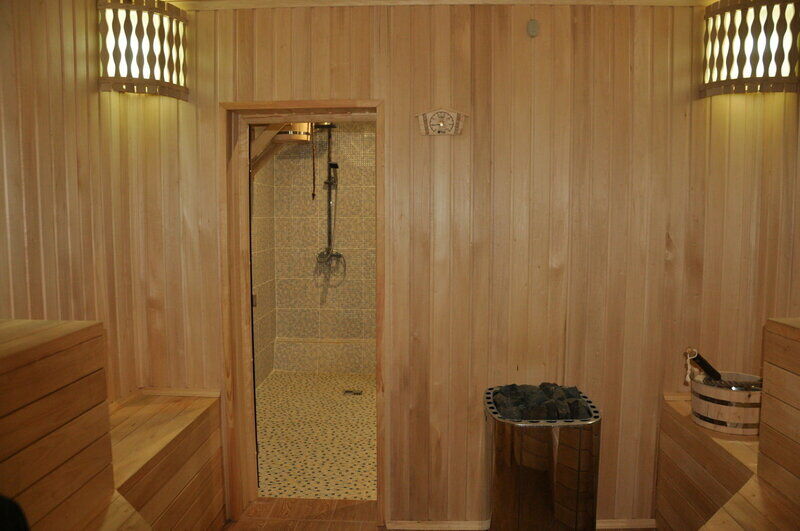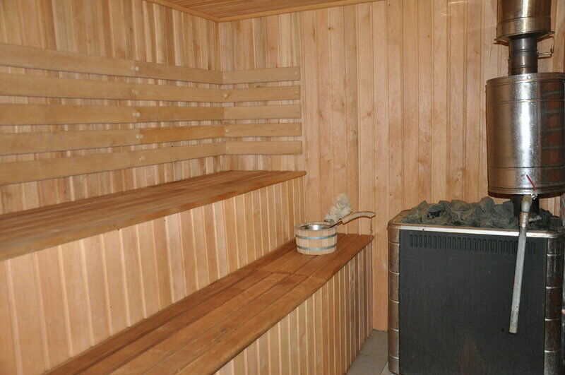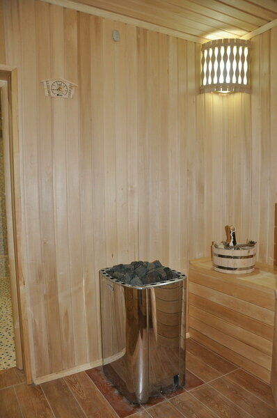 Вместительная трехсторонняя двухъярусная сауна с современным котлом позволяет отдыхать одновременно большой компанией до 16 человек. Возможно использование как сухого пара (финская сауна), так и влажного пара путем поливания каменки с кадки (классическая баня).