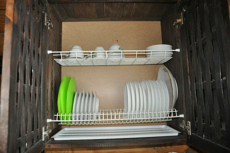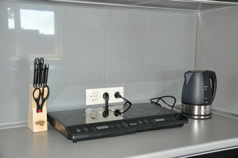 Из бытовой техники присутствует: Холодильник Indezit, электрическая варочная панель, микроволновая печь, чайник. Для каждого постояльца у нас есть набор посуды (тарелки, рюмки и стаканы, столовые приборы, чайный сервиз). На кухне присутствует дополнительный кран с чистой питьевой водой после тройной фильтрации.