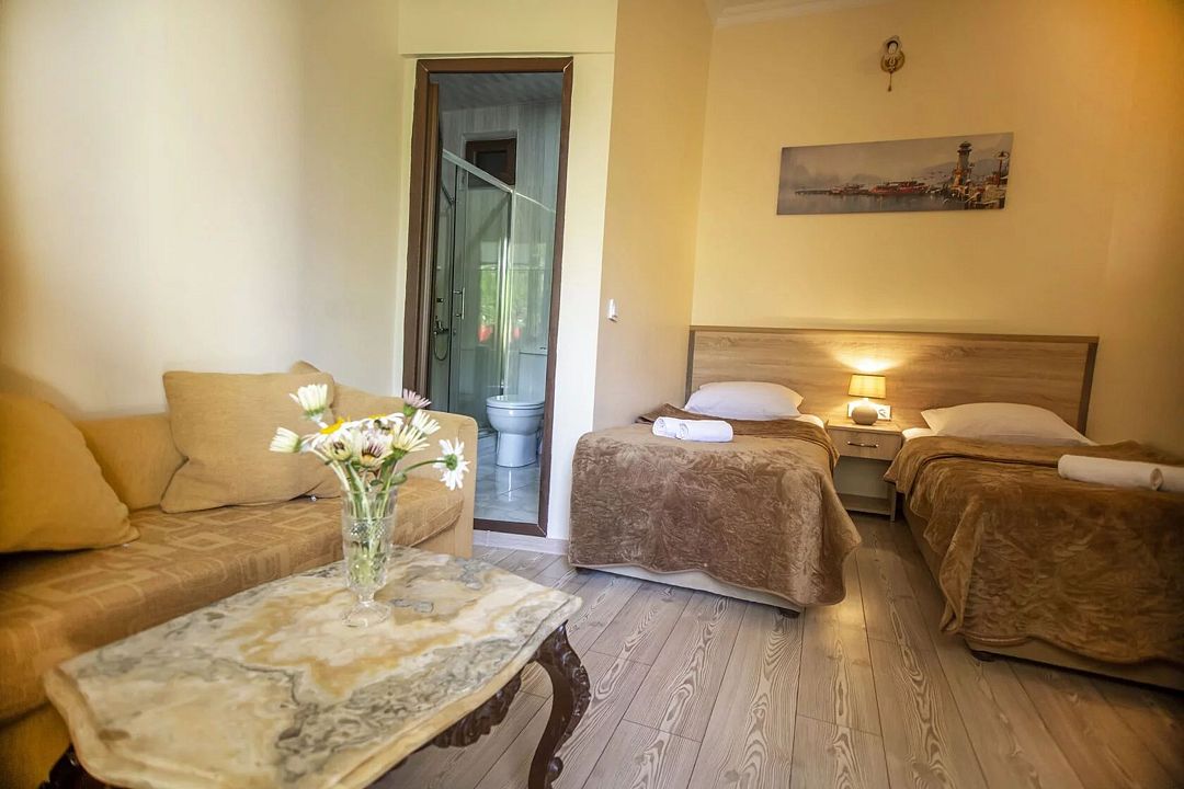 Путешествие с паройРЕКОМЕНДУЕМ для отдыха!!!Уютный отель с бассейном, с красивой зеленой ухоженной охраняемой территорией, где есть развлечения как для детей - горка, батут, качели, пинг-понг, так и для взрослых- зона барбекю со всем необходимым, за что отдельная благодарность хозяину Зурабу. Большая закрытая стоянка во дворе, не нужно было искать, где приткнуть машину на улице. Вкусные, сытные завтраки - шведский стол, Достаточный выбор блюд, так что голодными не оставались!