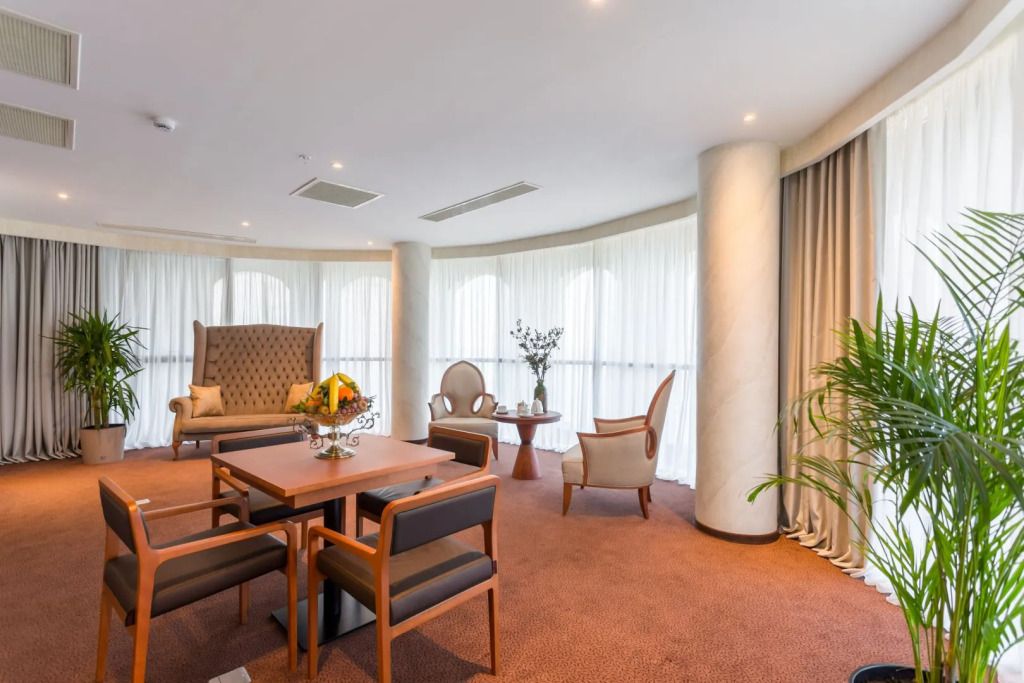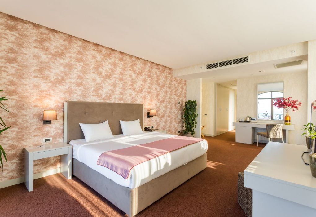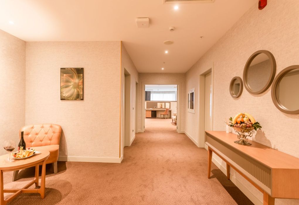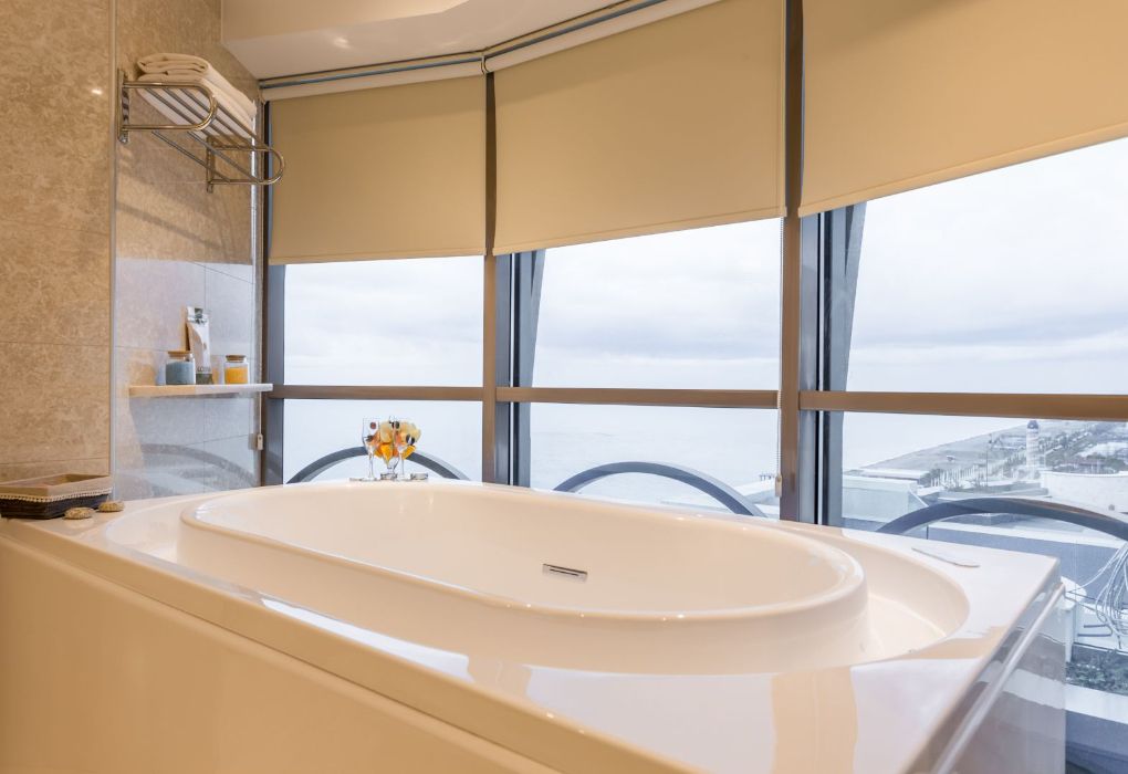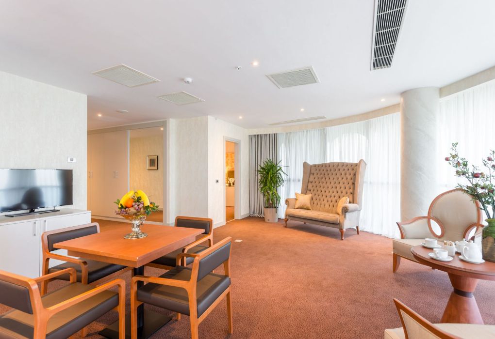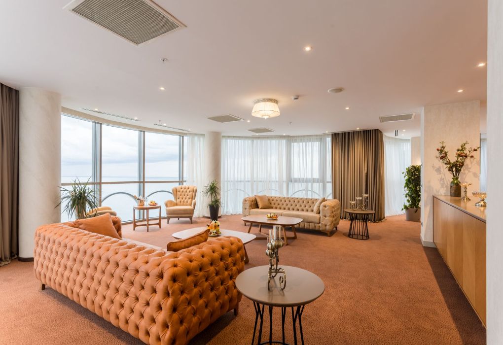 Президентский сьют содержит 2 спальни, столовую, гостиную и рабочую зоны, туалеты, две террасы, частный бассейн и джакузи. Из номера открывается вид на море и город.Услуги и удобства