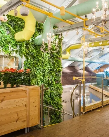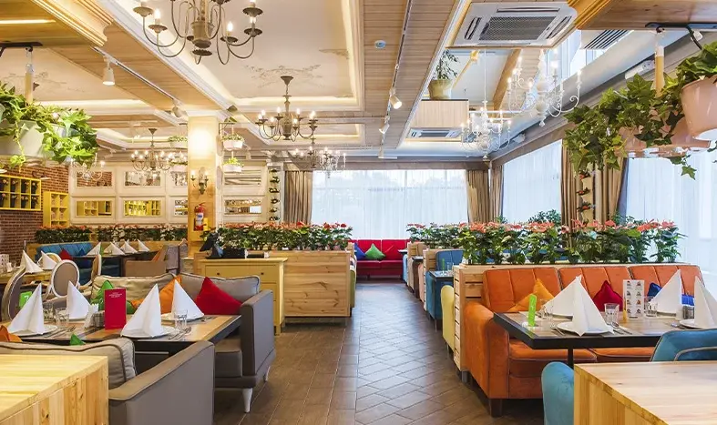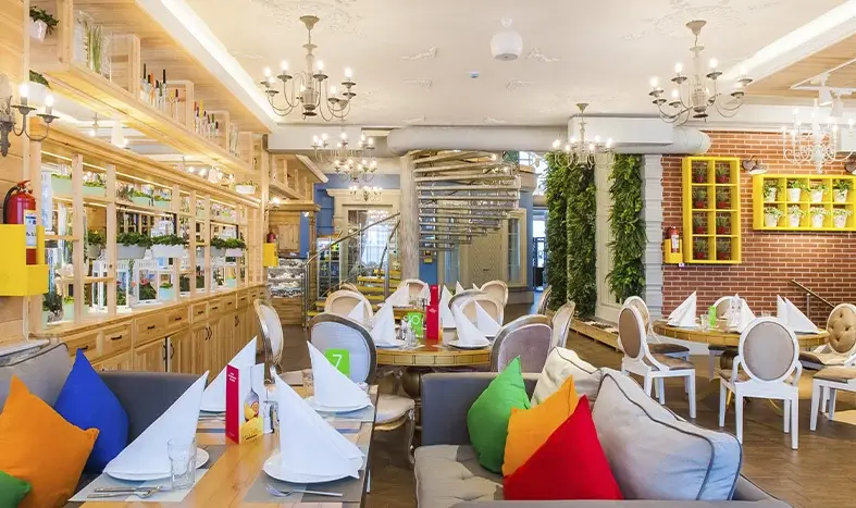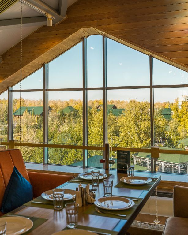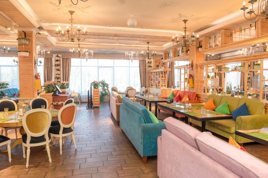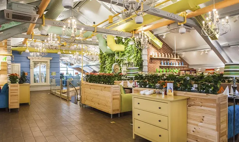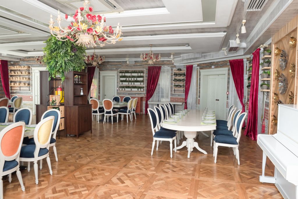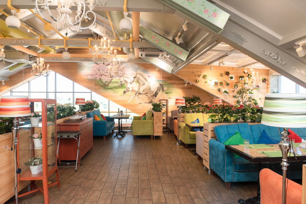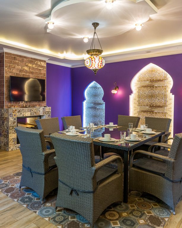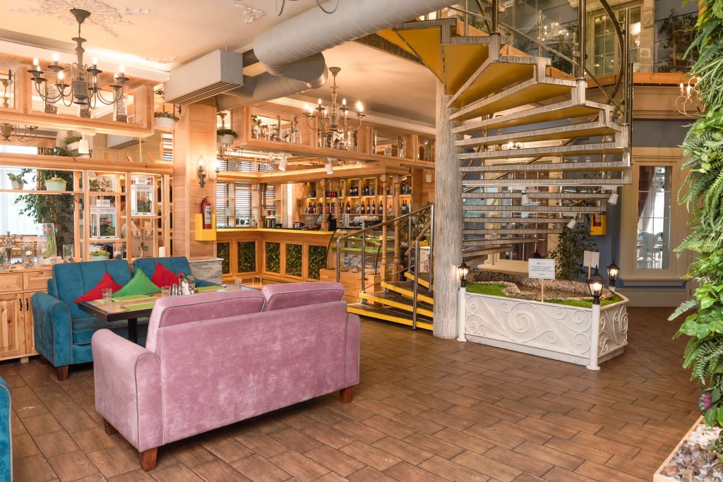 Это 3-х этажный ресторан с изысканным и стильным интерьером, с двумя вип-залами на 30 и 60 человек. Вместимость ресторана — 250 человек.
