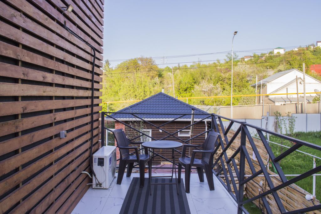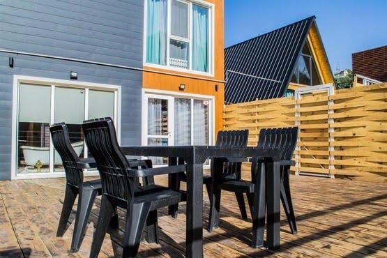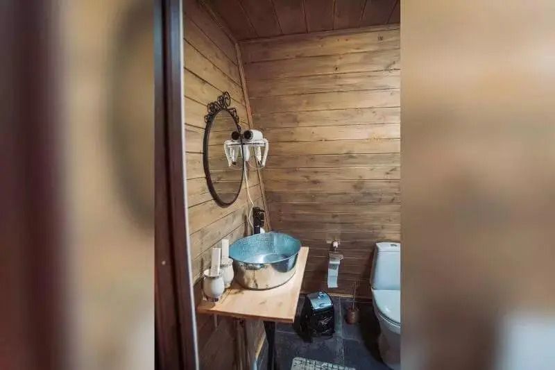Для удобства есть обливное ведро, сан узел с биде. В зоне отдыха стол с лавочками и кружки для пива.