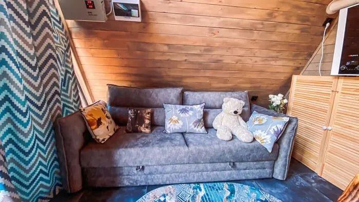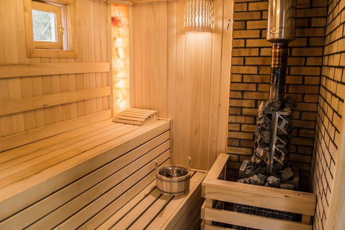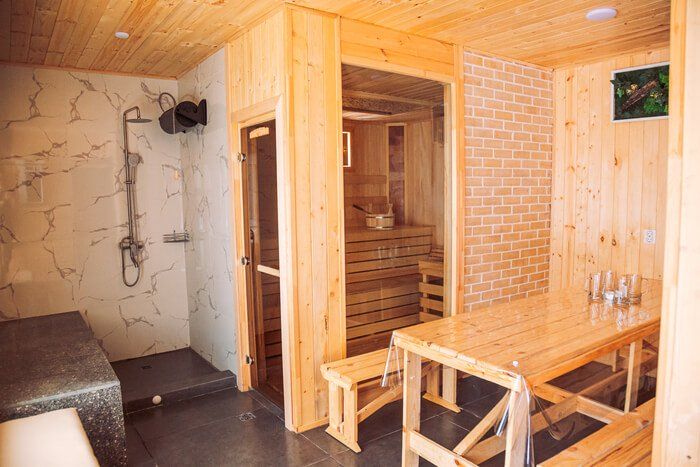 Баня выполнена в современном стиле, с гималайской солью и можжевельным полотном. Уникальные тона интерьера и отделка из дерева придают натуральность и спокойствие.