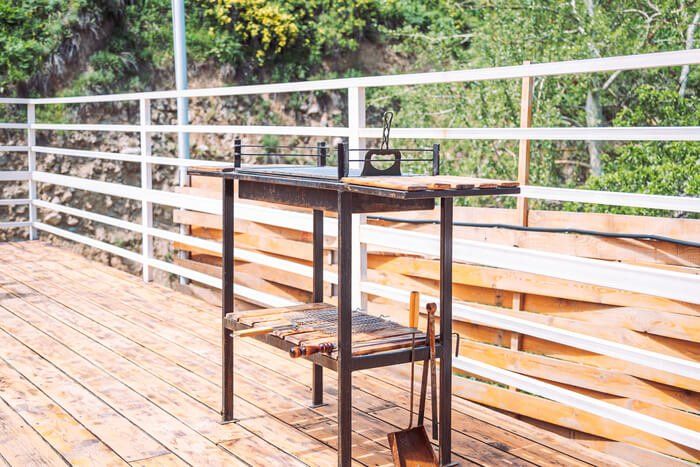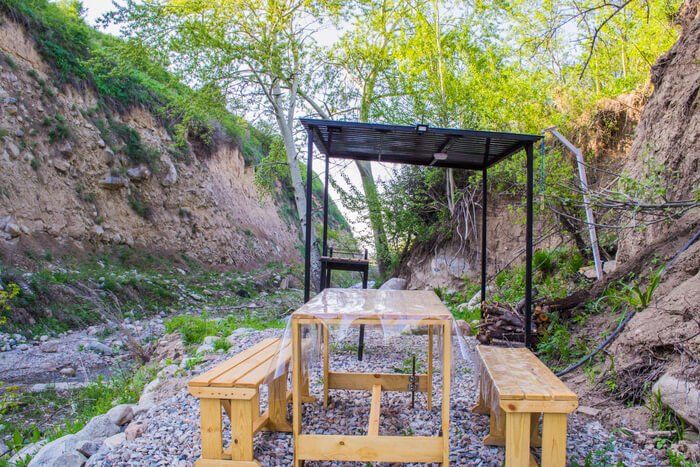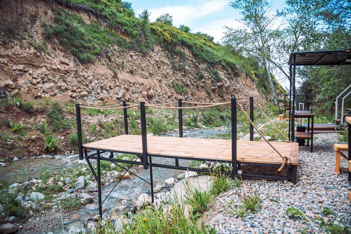 - На реке у каждого свой стол с лавочками, зона барбекю под навесом, мангал, мост прямо над рекой;
