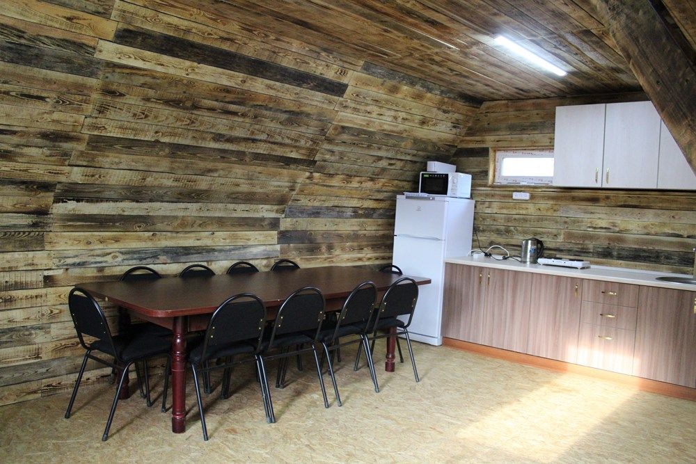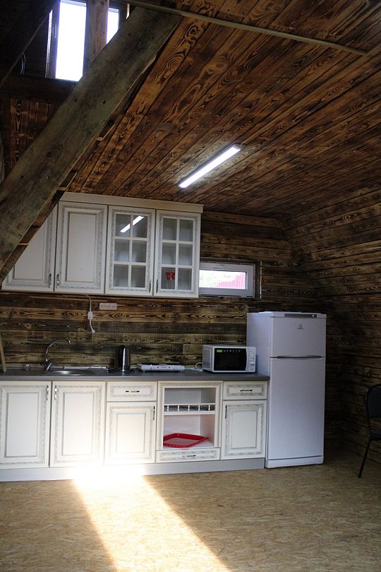 - Обеденная зона: Стол на 25 человек, кухня, холодильник, микроволновка, электроплита.