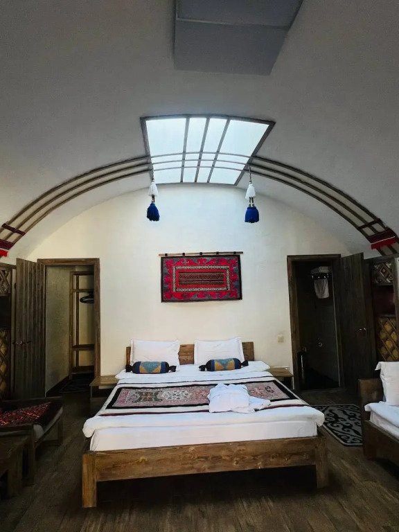 - этно домик с очагом внутри с выходом в банно-оздоровительный комплекс — идеально подходит для компаний друзей или родственников до 8 человек, где можно отдохнуть, а также насладиться самыми вкусными блюдами национальной кухни;