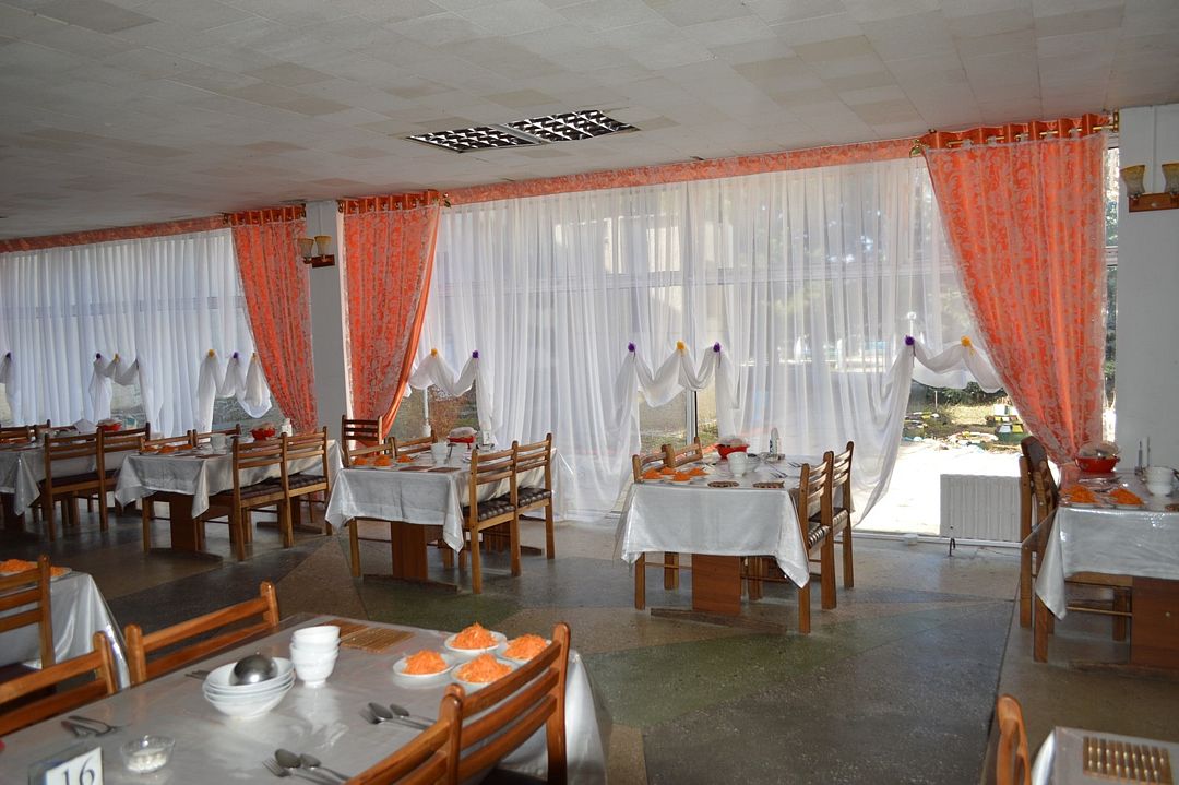 На территории санатория, европейская, национальная кухни, работает с 10:00.