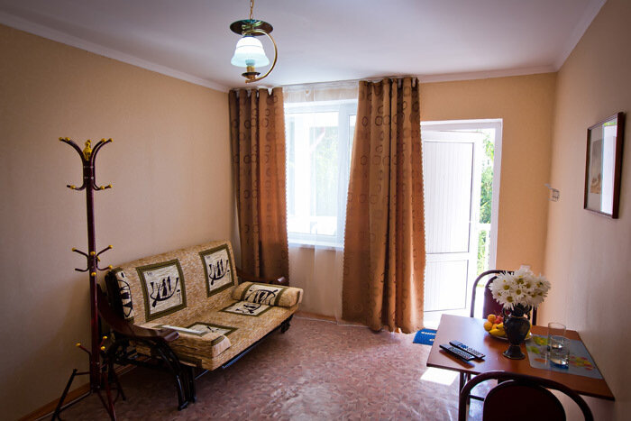 Гостевой комплекс состоит из трехэтажного корпуса и нескольких отдельно стоящих коттеджей. Жилой фонд включает в себя 110 номеров категории Полулюкс, в каждом из которых имеется санузел с душем, телевизор, холодильник и необходимый набор мебели.