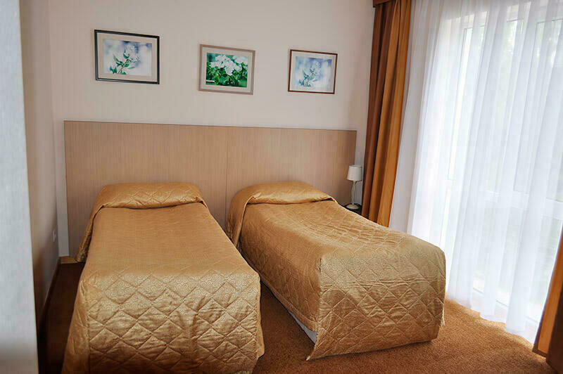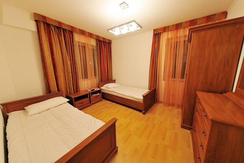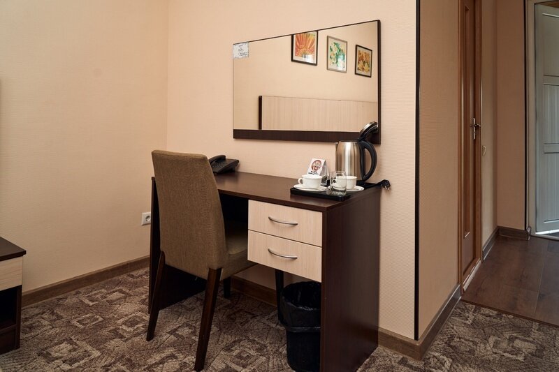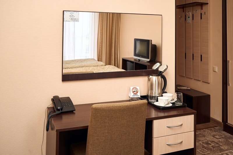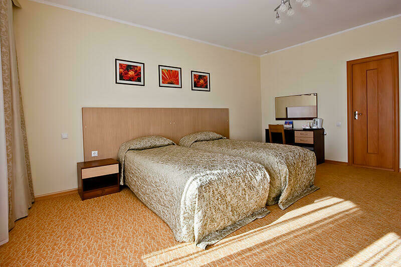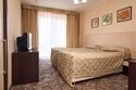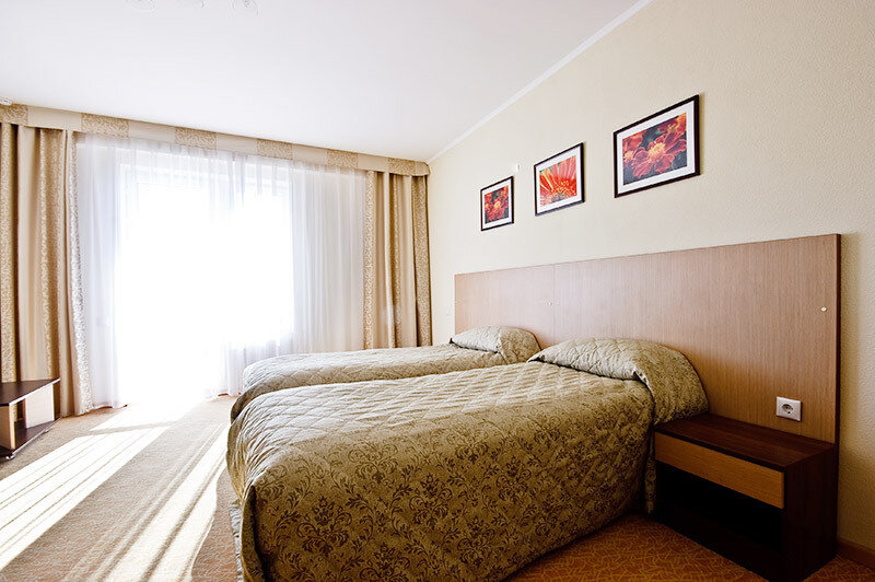 18 кв.м, две кровати (сдвигаются), прикроватные тумбочки, шкаф-купе, стол ,стул, мини-бар, сейф, ТВ, телефон, интернет, фен, эл.чайник, с/у, душ.кабина