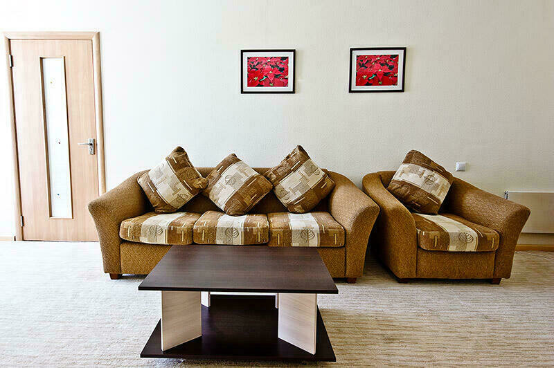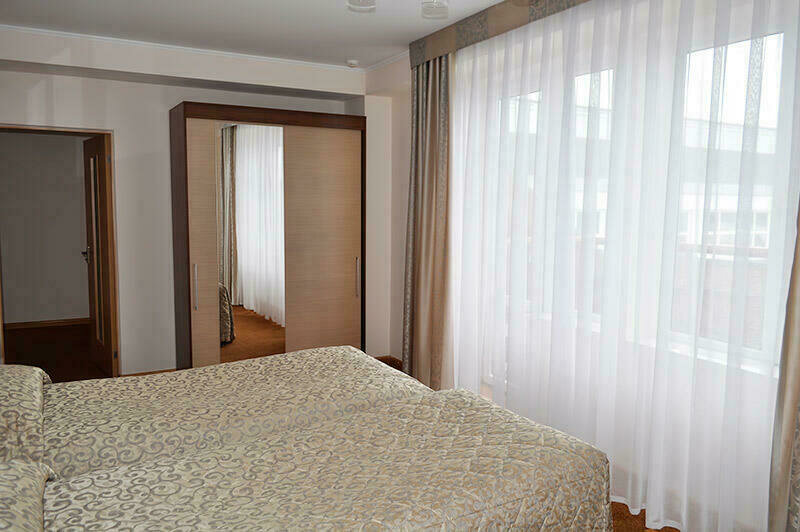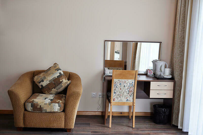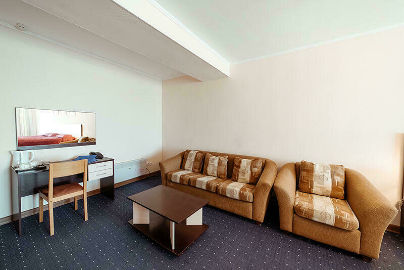 44 кв.м, две кровати (сдвигаются), прикроватные тумбочки, раскладной диван с 2 креслами, шкаф-купе, журнальный столик, стол, стул, тумба, мини-бар, ТВ, сейф, телефон, интернет, фен, эл. чайник. С/у, ванна