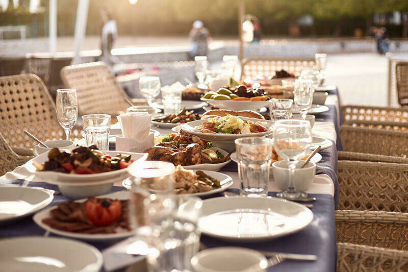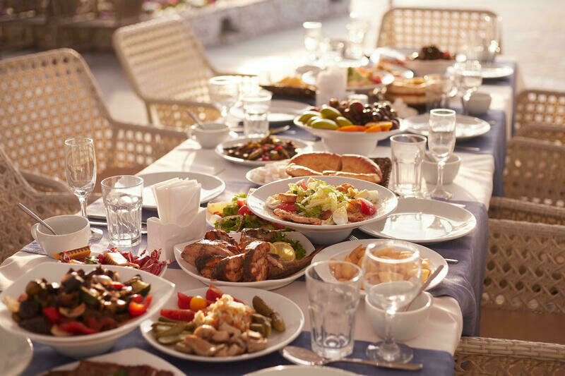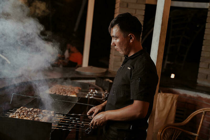Специальное меню от шеф-повара вас приятно удивит. По вашему желанию организуем барбекю на пляже, «гвоздем программы» станет барашек на вертеле.