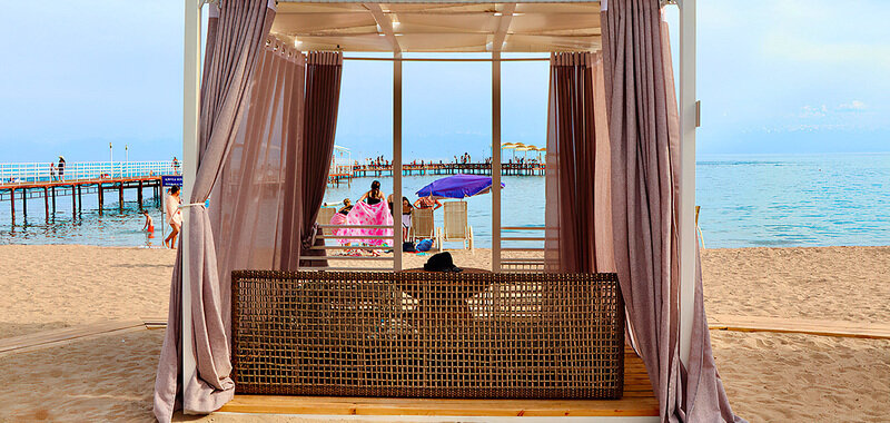 Инфраструктура: лежаки, зонтики, шезлонгиПесчаный пляж