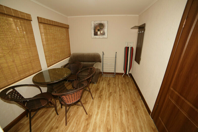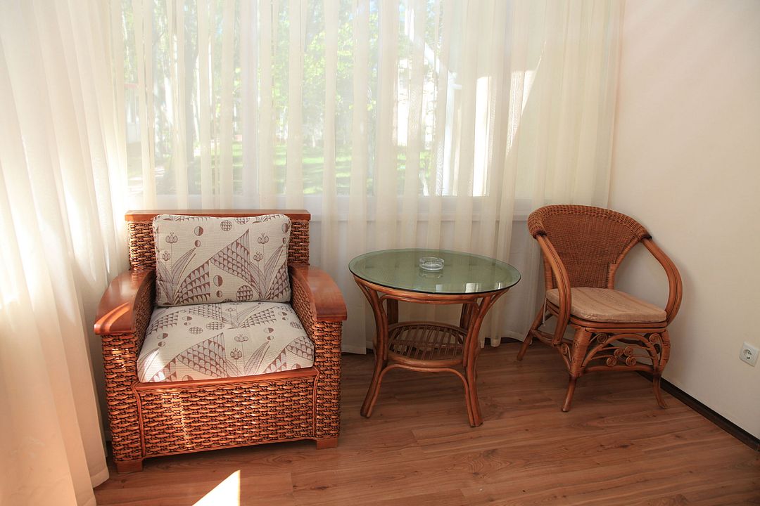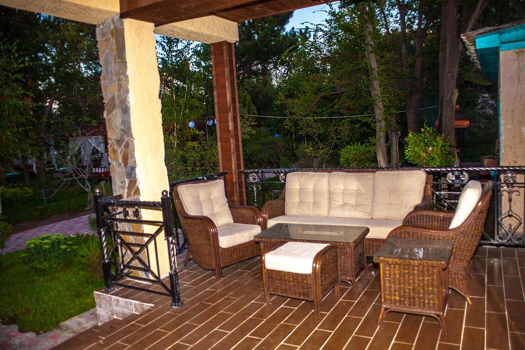 в комнатах есть кондиционер, телевизор, электрочайник, а в коттеджах имеется веранда, оборудованная ротанговой мебелью и сушилкой.