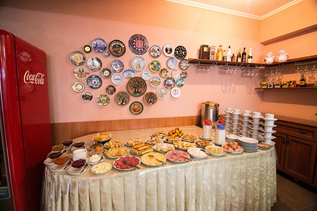 В кафе отеля вы можете отведать блюда национальной и европейской кухни, или сделать индивидуальный заказ. Для корпоративных клиентов мы предлагаем: кофе-брейки, фуршеты, обеды и ужины. Постояльцам же по утрам организуется Шведский стол, цена за завтрак включена в стоимость.