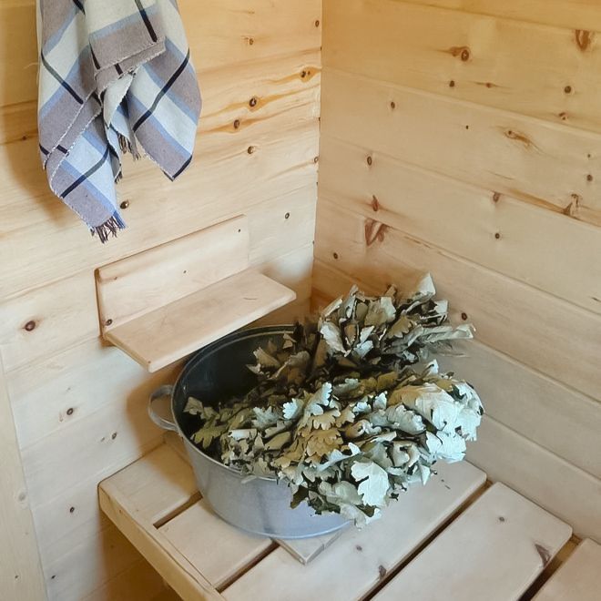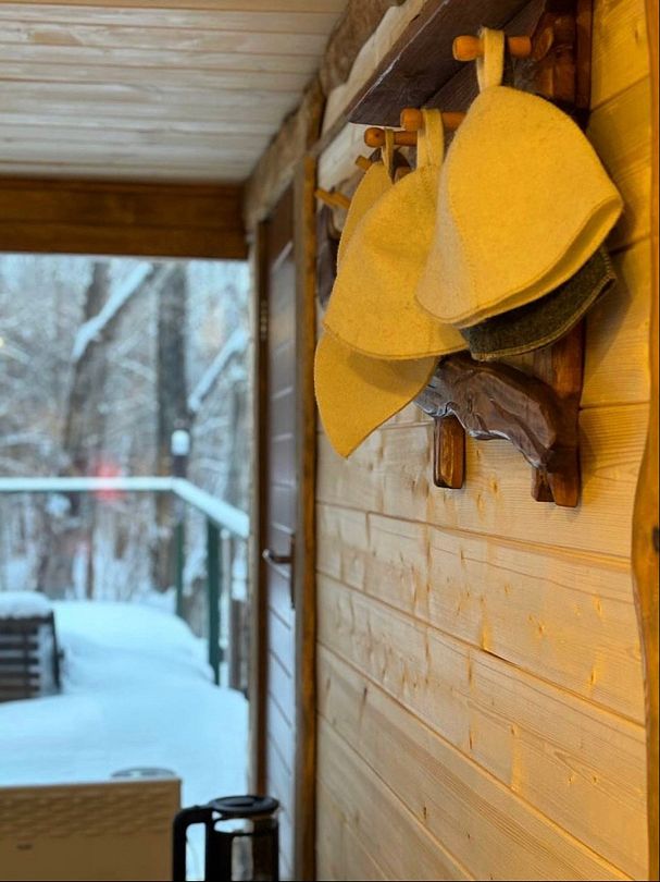 После банных процедур можно отдохнуть в светлой комнате с панорамными окнами, из которых открывается прекрасный вид на лес. Для тех, кто хочет насладиться свежим воздухом, предусмотрен просторный пирс, где можно провести время на природе в компании друзей.