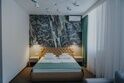 Люкс состоит из двух больших комнат, оформленных в дизайнерском решении, создающих романтическую обстановку для гостей, приезжающих сюда отдохнуть. В спальне двуспальная кровать (немецкий ортопедический матрас, чехол выполнен из высококачественного гипоаллергенного жаккарда, постельное белье производства Германия).