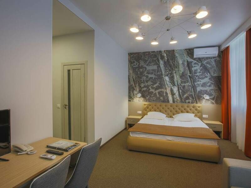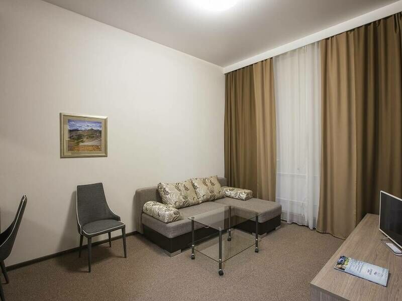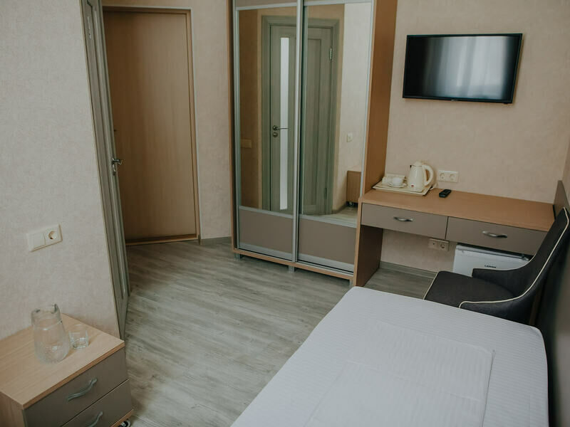 Уютный номер с удобной современной мебелью. Одна полутороспальная или двуспальная кровать (ортопедический матрас производства Германия с чехлом из высококачественного гипоаллергенного жаккарда), туалетный столик, встроенный холодильник, ЖК-телевизор, кондиционер, кресла, прикроватные тумбы, в прихожей встроенный шкаф для одежды, сейф.