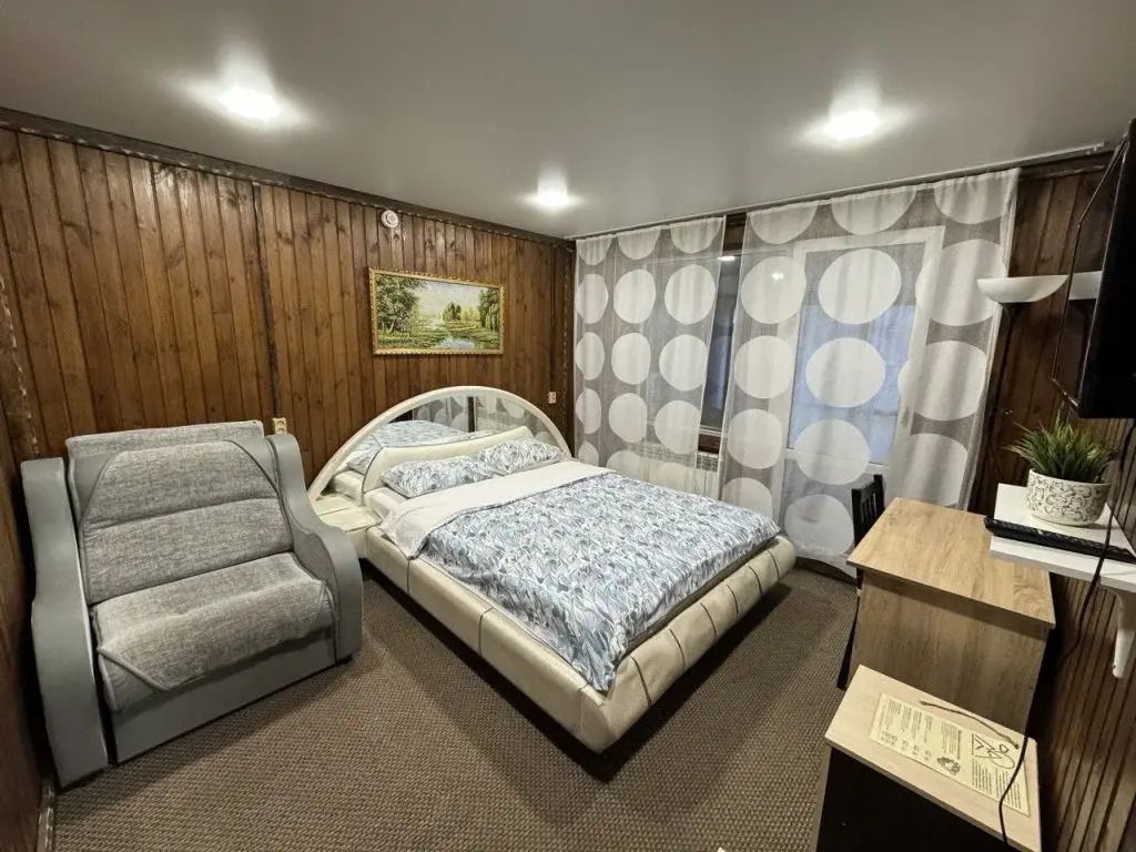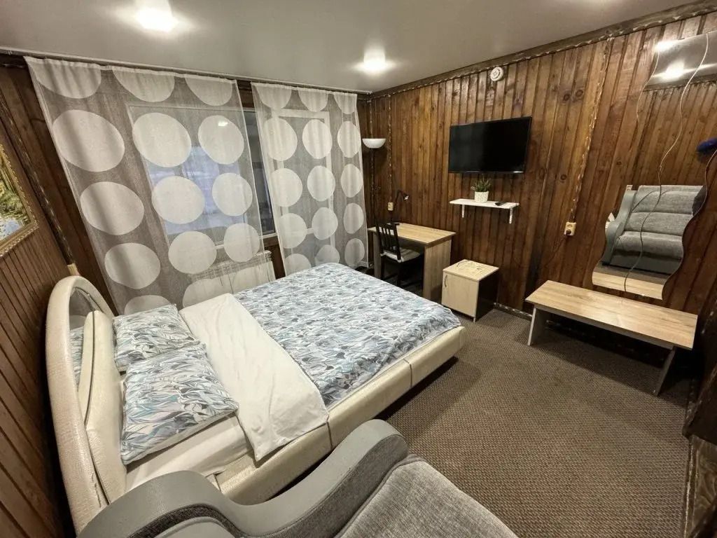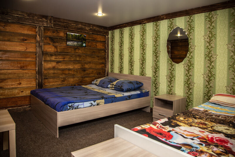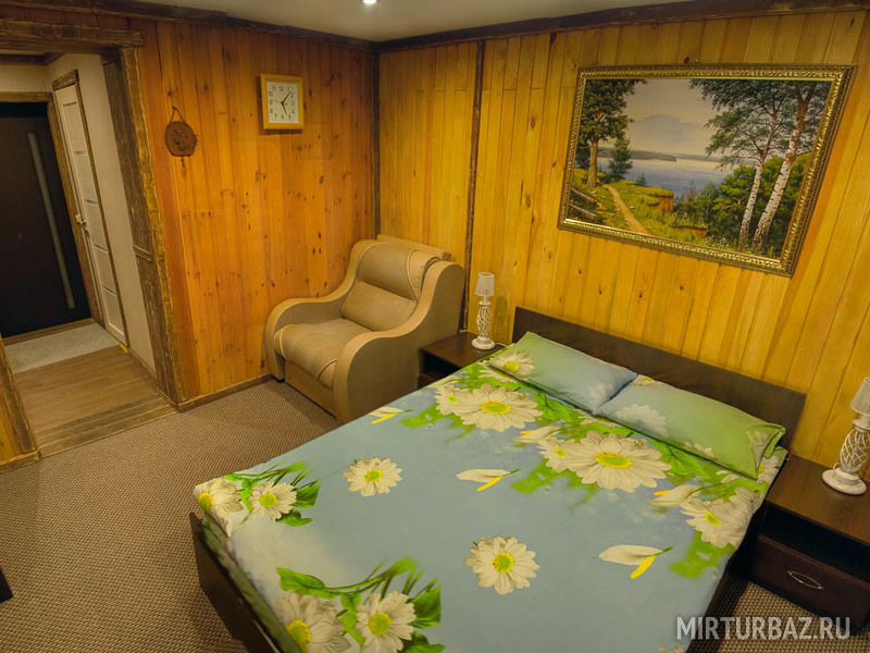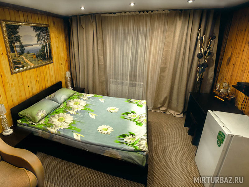 Комфортабельный номер, в котором есть все необходимое для проживания: удобная мебель, холодильник, гигиенические принадлежности, телевизор. В оформлении использовано множество деревянных деталей, которые создают атмосферу уютного охотничьего домика.