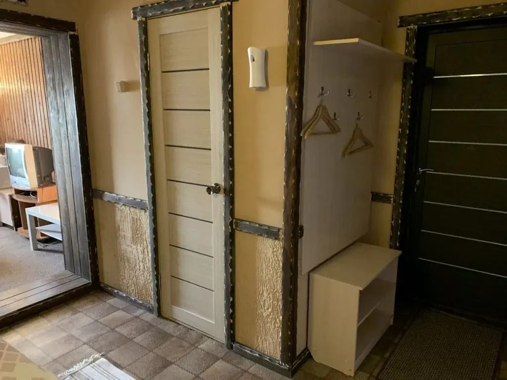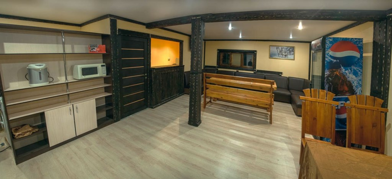 В доме есть все необходимое для проживания: удобная мебель, холодильник, гигиенические принадлежности, телевизор. В оформлении использовано множество деревянных деталей, которые создают атмосферу уютного охотничьего домика.