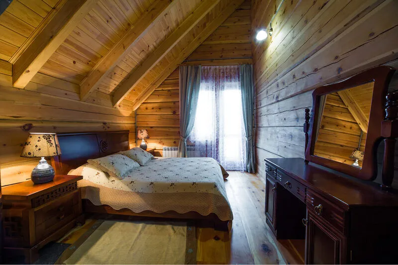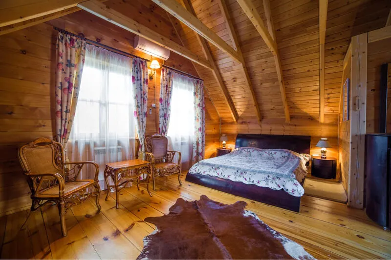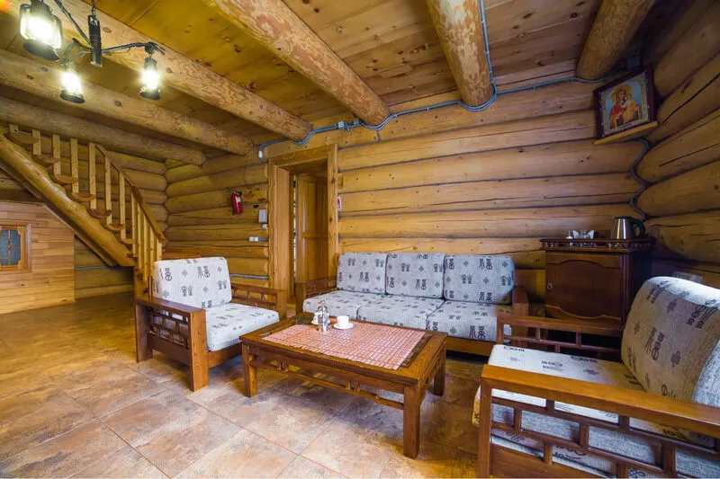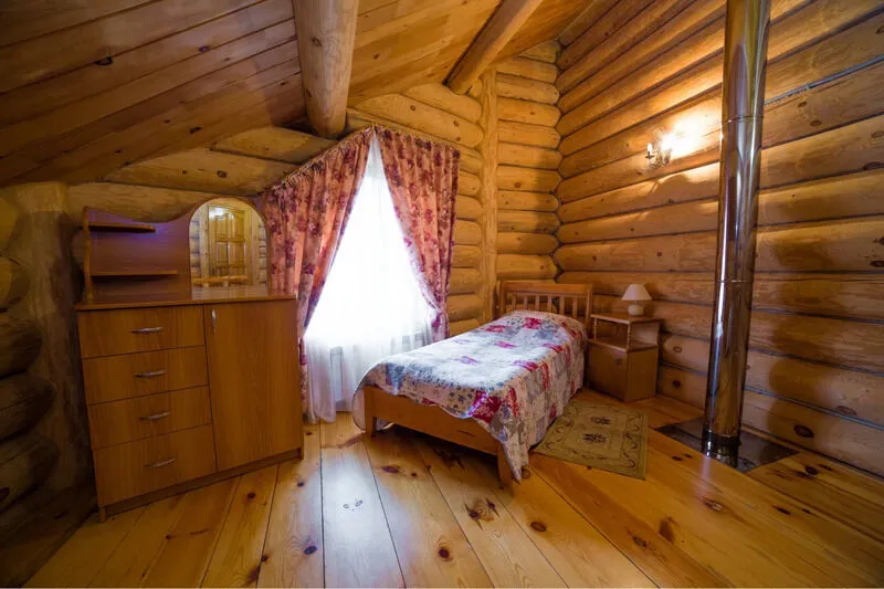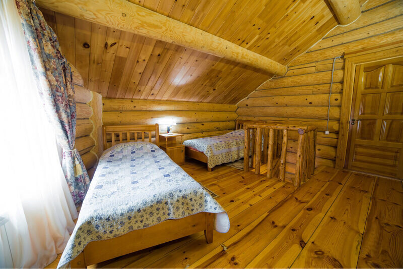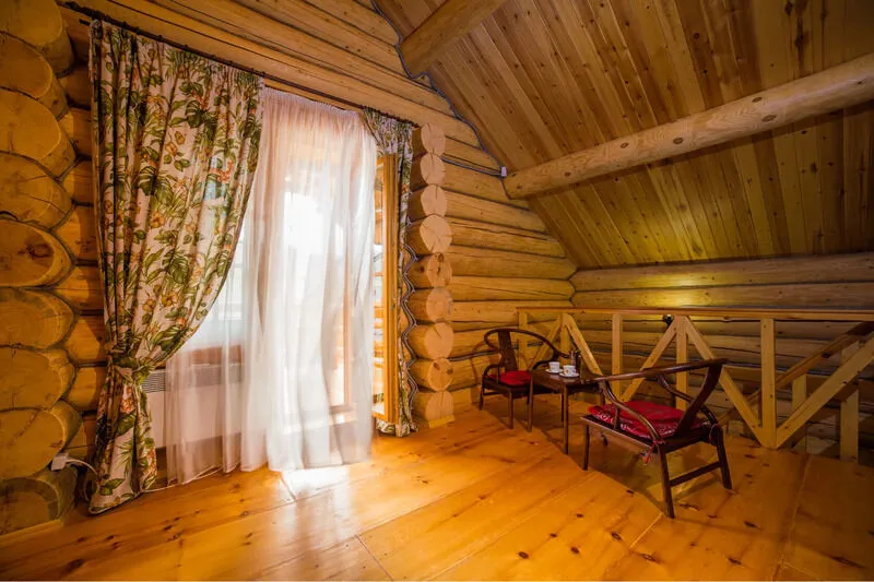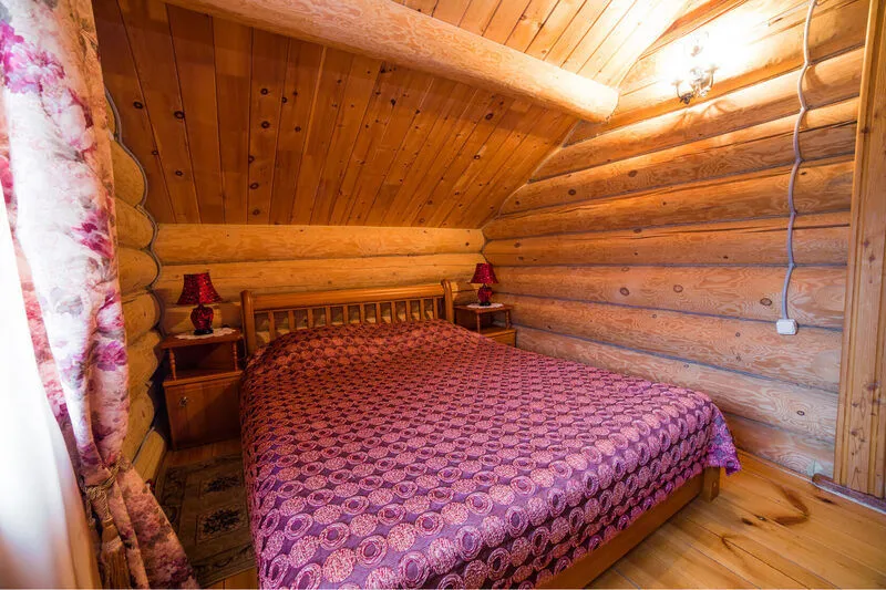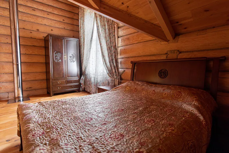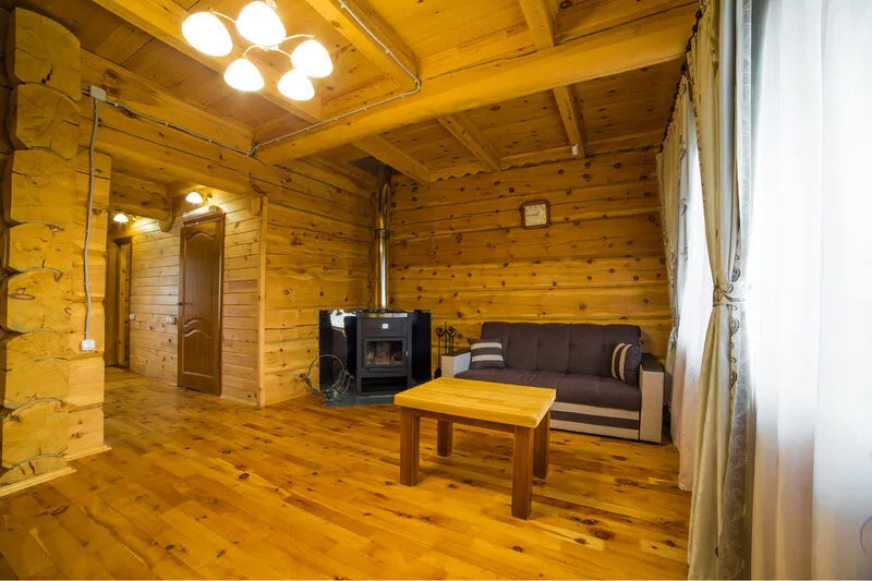 Двухэтажный коттедж из хвойных пород дерева. На первом этаже гостиная с мягкой зоной отдыха. На втором этаже уютная спальня.