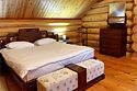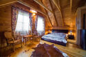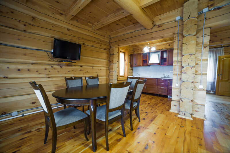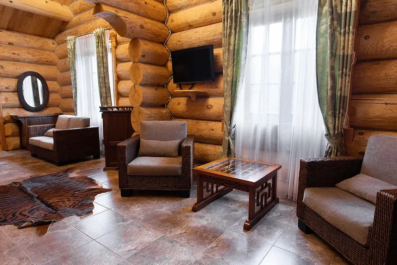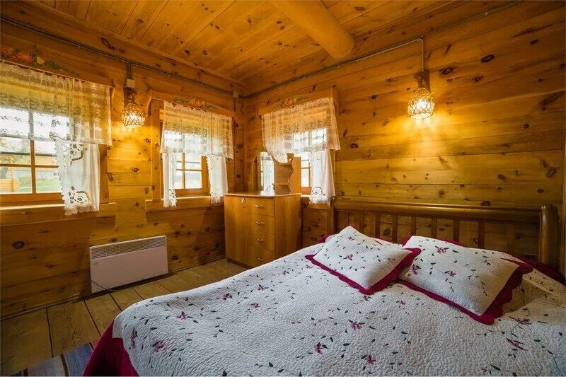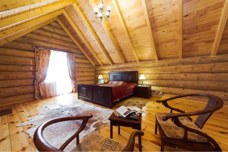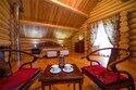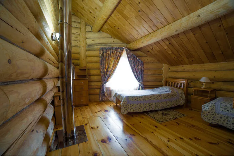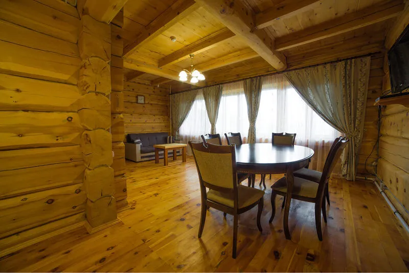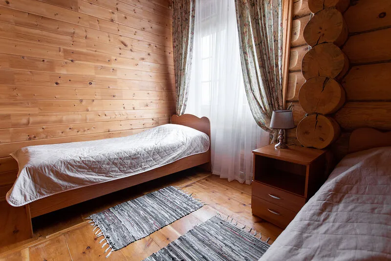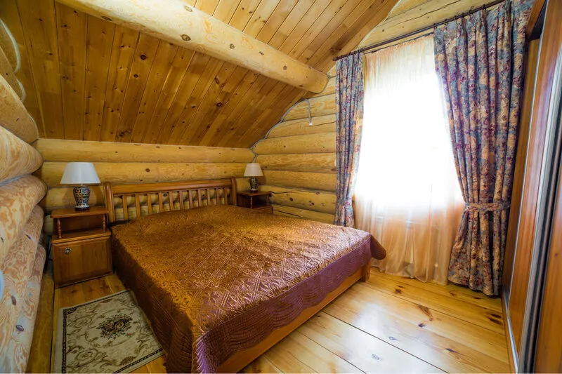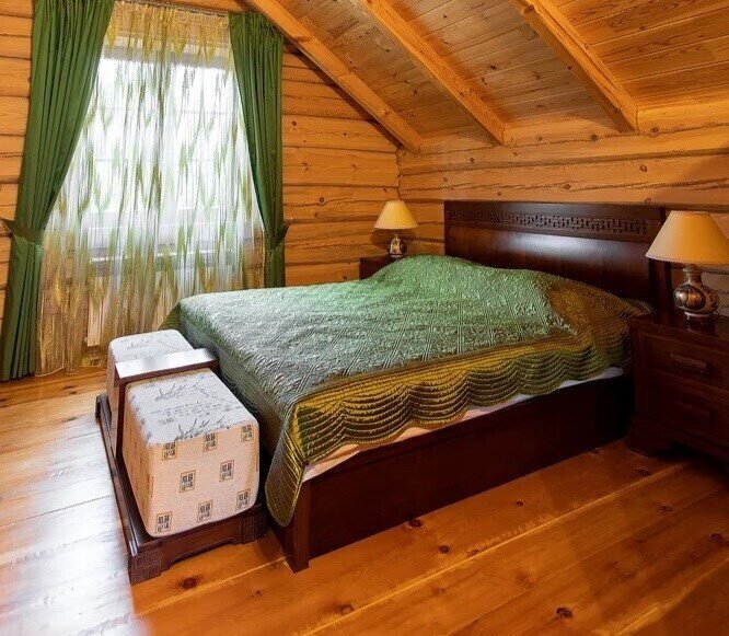 Двухэтажный коттедж из хвойных пород дерева. На первом этаже гостиная с мягкой зоной отдыха. На втором этаже уютная спальня.