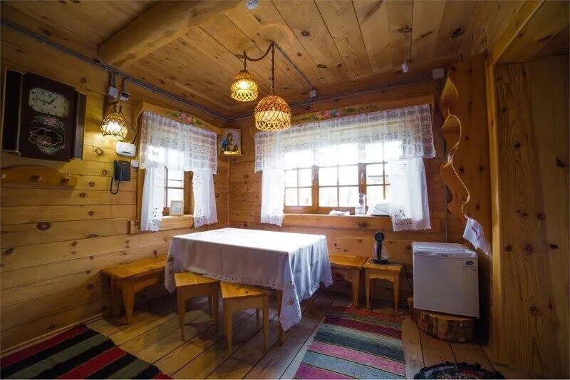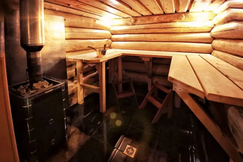 Инфраструктура: зона отдыхаСмотрите — там, на берегу ручья, стоит ладная осиновая банька. Мягкий пар в парной, помывочная, обливная кадка с родниковой водой и комната отдыха. Красота!