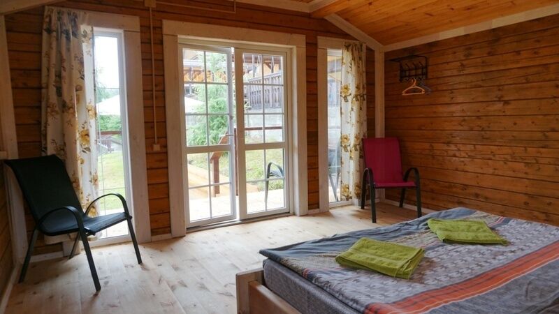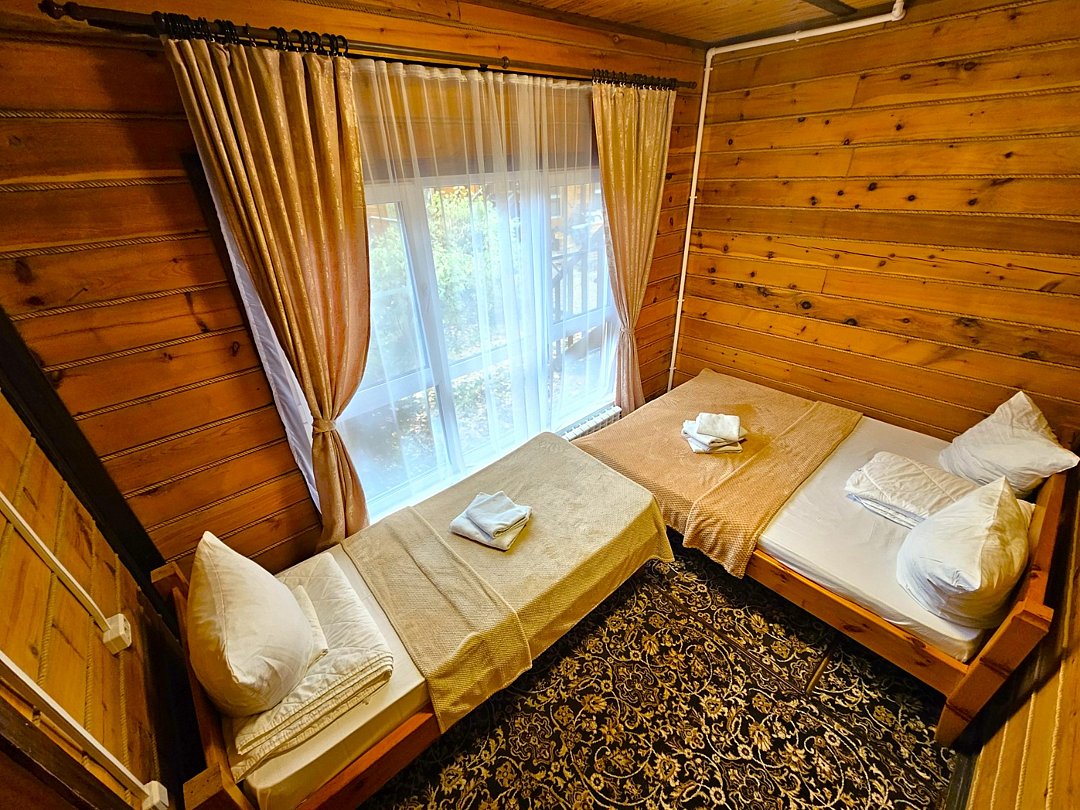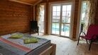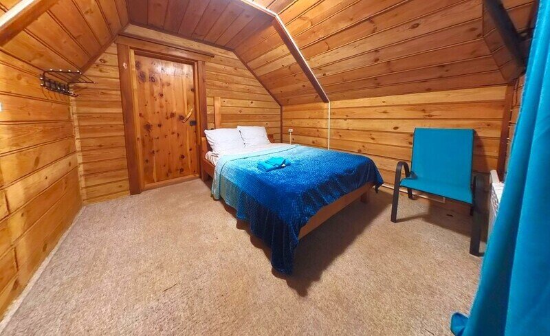 Два домика из бруса. Двуспальная кровать, два кресла, журнальный столик, крыльцо для отдыха. Туалет и душ в доме.