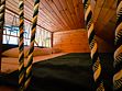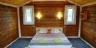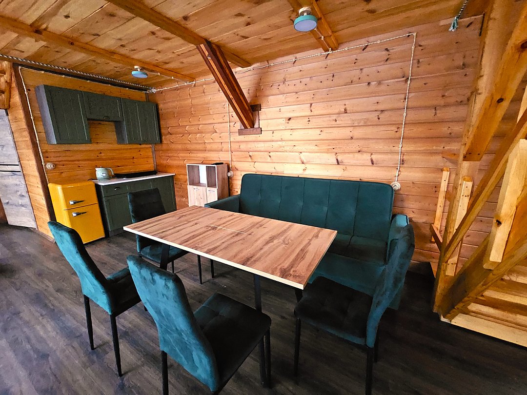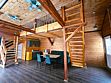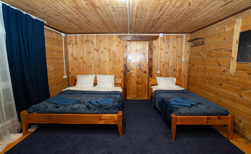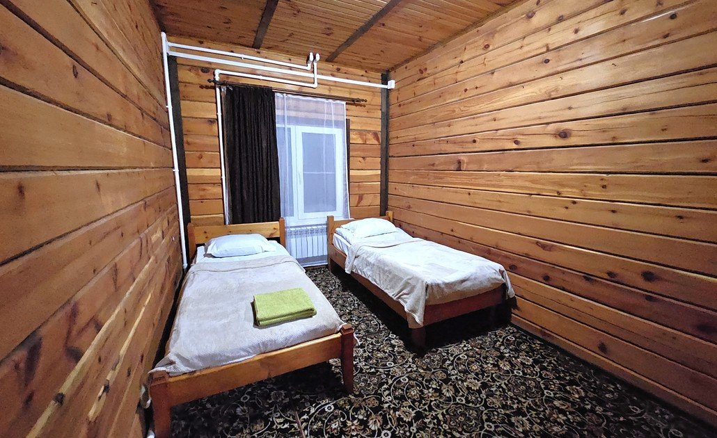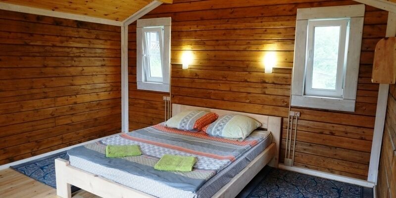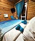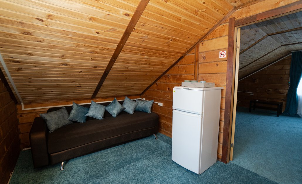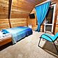 Два уровня, на верхнем уровне 2 изолированные спальные зоны, на нижнем — диван раскладной. Дом в тихой части базы.