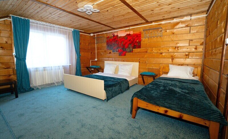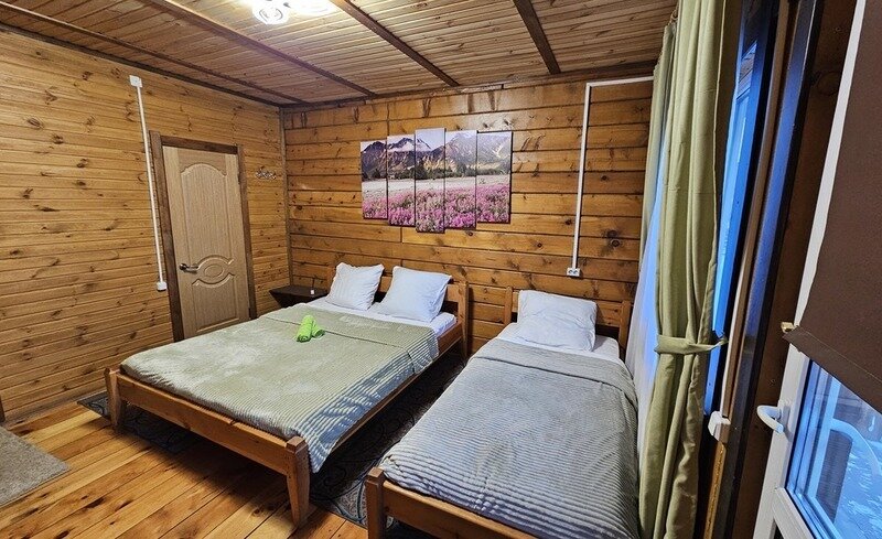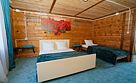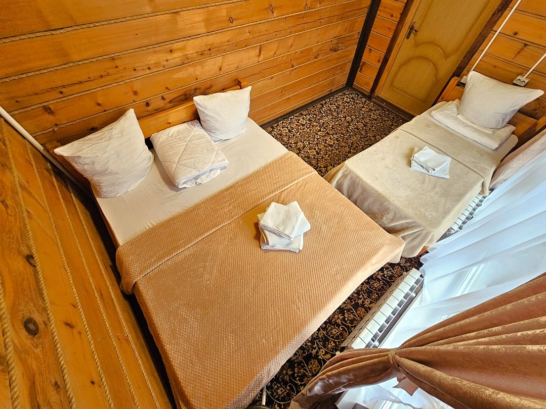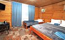 Небольшой номер для 3-4 человек, оборудованный одной двуспальной и одной односпальной кроватями и столиком.
