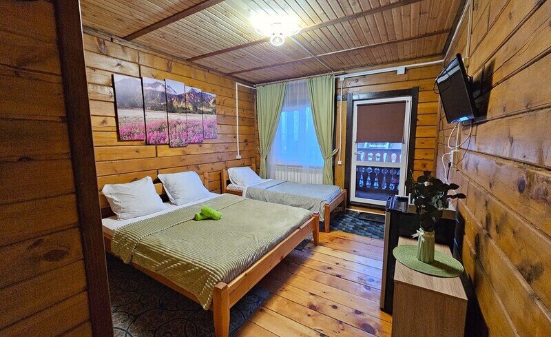 Семейный, однокомнатный номер, рассчитан на проживание от 5 до 7 человек, оборудован: раскладным диваном, одной двуспальной и односпальной кроватями. Также есть собственный санузел, душ, полотенца и балкон.