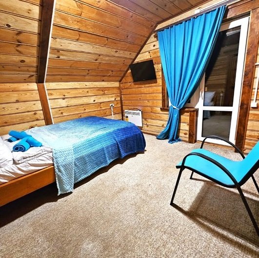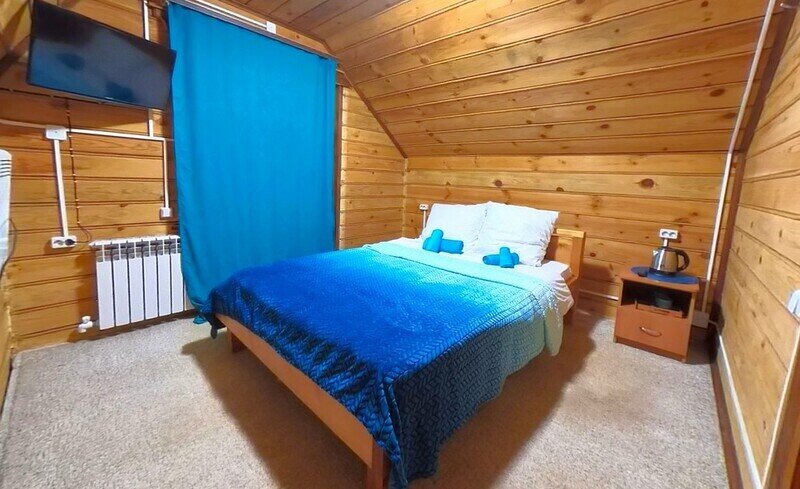 Оборудован двуспальной кроватью, столиком и телевизором.