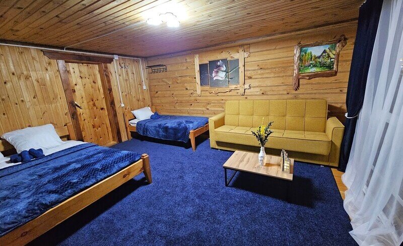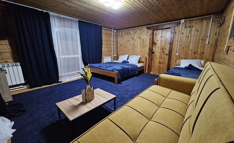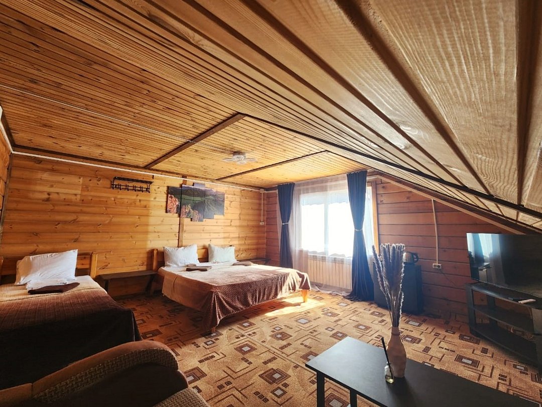 Небольшой номер для 4-5 человек, оборудованный одной двуспальной и одной односпальной кроватями, раскладным диваном и столиком.